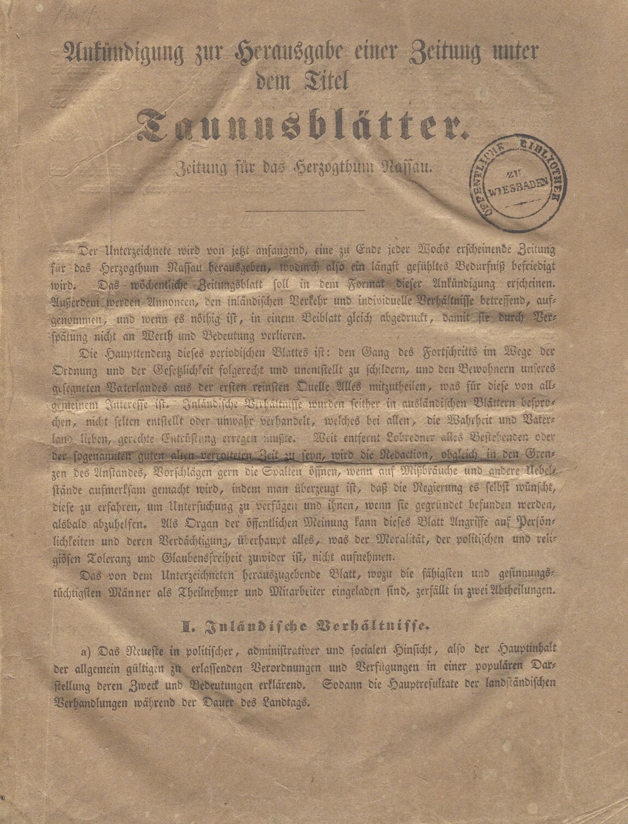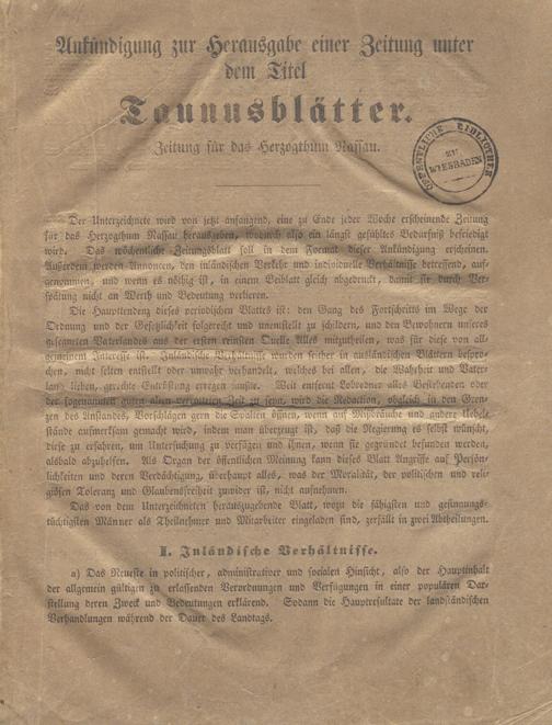 Der Unterzeichnete wird von jetzt anfangend, eine zu Ende jeder Woche erscheinende Zeitung für das Herzogthum Nassau herausgeben, töodrnch also ein längst gefühltes Bedürfniß befriedigt wird. Das wöchentliche -Zeitüllgsblatt soll in dem Format dieser Ankündigung erscheinen. Außerdem werden Annoncen, den inländischen Verkehr und individuell Verhältnisse betreffend, auf# -genommen, und wenn es nöthig ist, in einem Beiblatt gleich abgedruckt, damit ne durch Verspätung nicht an Werth und Bedeutung verlieren.