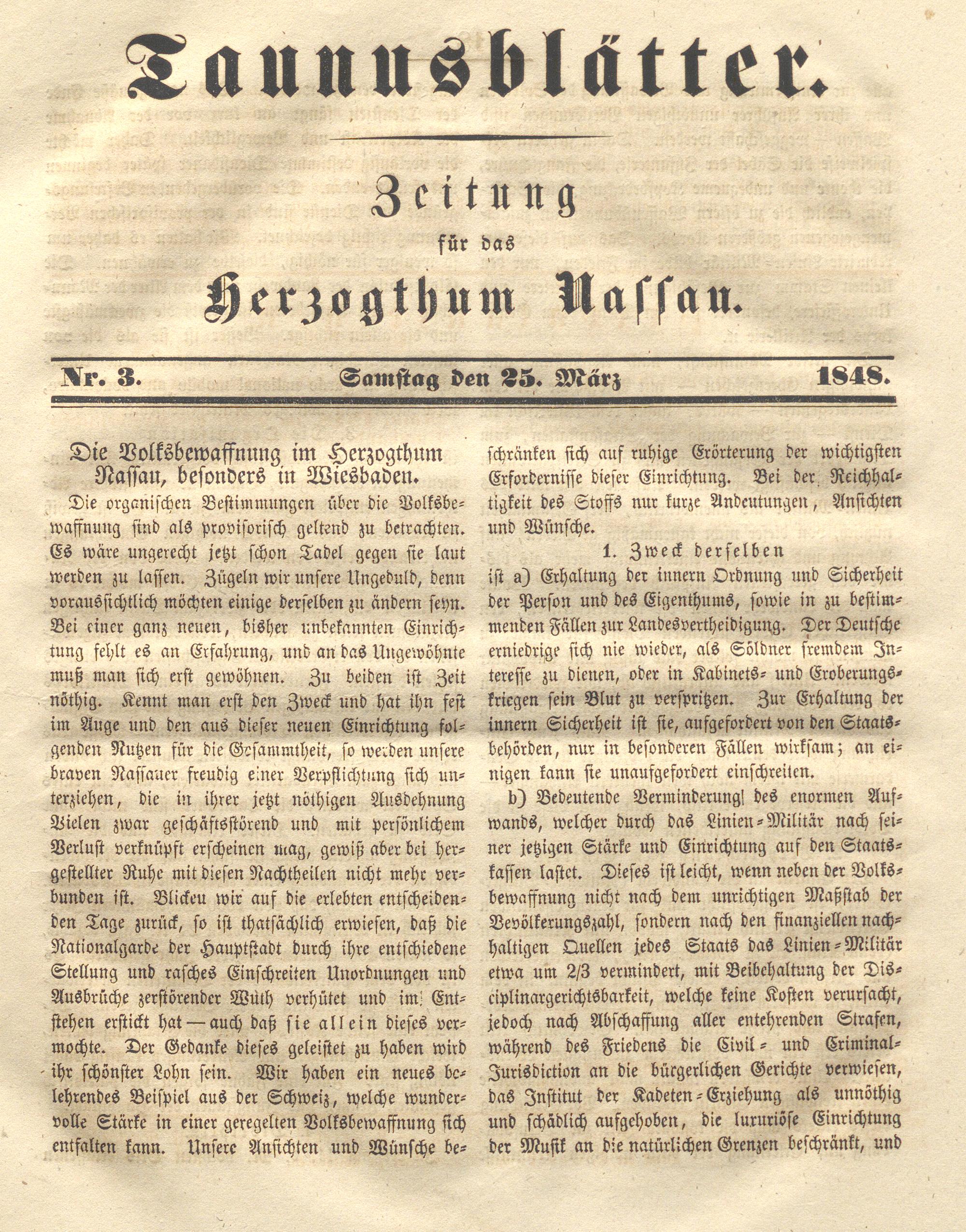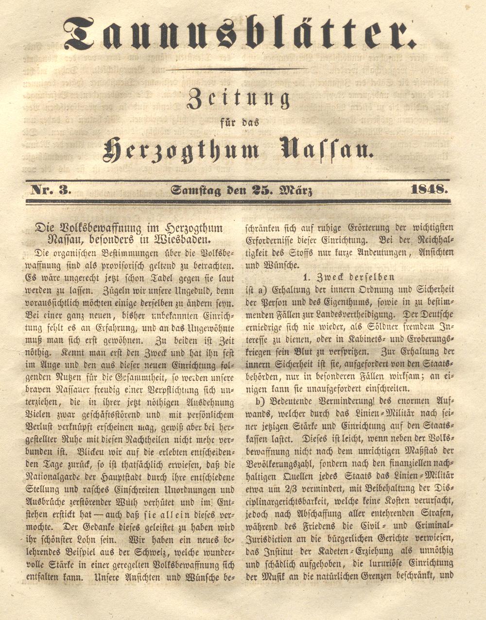 Die organischen Bestimmungen über die Volksbewaffnung sind als provisorisch geltend zu betrachten. Es wäre ungerecht jetzt schon Tadel gegen sie laut werden zu lassen. Zügeln wir unsere Ungeduld, denn voraussichtlich möchten einige derselben zu ändern seyn. Bei einer ganz neuen, bisher unbekannten Einrichtung fehlt es an Erfahrung, und an das Ungewohnte muß man sich erst gewöhnen. Zu beiden ist Zeit nöthig. Kennt man erst den Zweck und hat ihn fest im Auge und den aus dieser neuen Einrichtung folgenden Nutzen für die Gesammtheit, so werden unsere braven Nassauer freudig einer Verpflichtung sich unterziehen, die in ihrer jetzt nöthigen Ausdehnung Vielen zwar geschäftsstörend und mit persönlichem Verlust verknüpft erscheinen mag, gewiß aber bei her- gestellter Ruhe mit diesen Nachtheilen nicht mehr verbunden ist. Blickeu wir aus die erlebten entscheidenden Tage zurück, so ist thatsächlich erwiesen, daß die Nationalgarde der Hauptstadt durch ihre entschiedene Stellung und rasches Einschreiten Unordnungen und Ausbrüche zerstörender Wüth verhütet und int; Entstehen erstickt hat — auch daß sie allein dieses vermochte. Der Gedanke dieses geleistet zu haben wird ihr schönster Lohn sein. Wir haben ein neues belehrendes Beispiel aus der Schweiz, welche wundervolle Stärke in einer geregelten Volksbewaffnung sich entfalten kann. Unsere Ansichten und Wünsche be