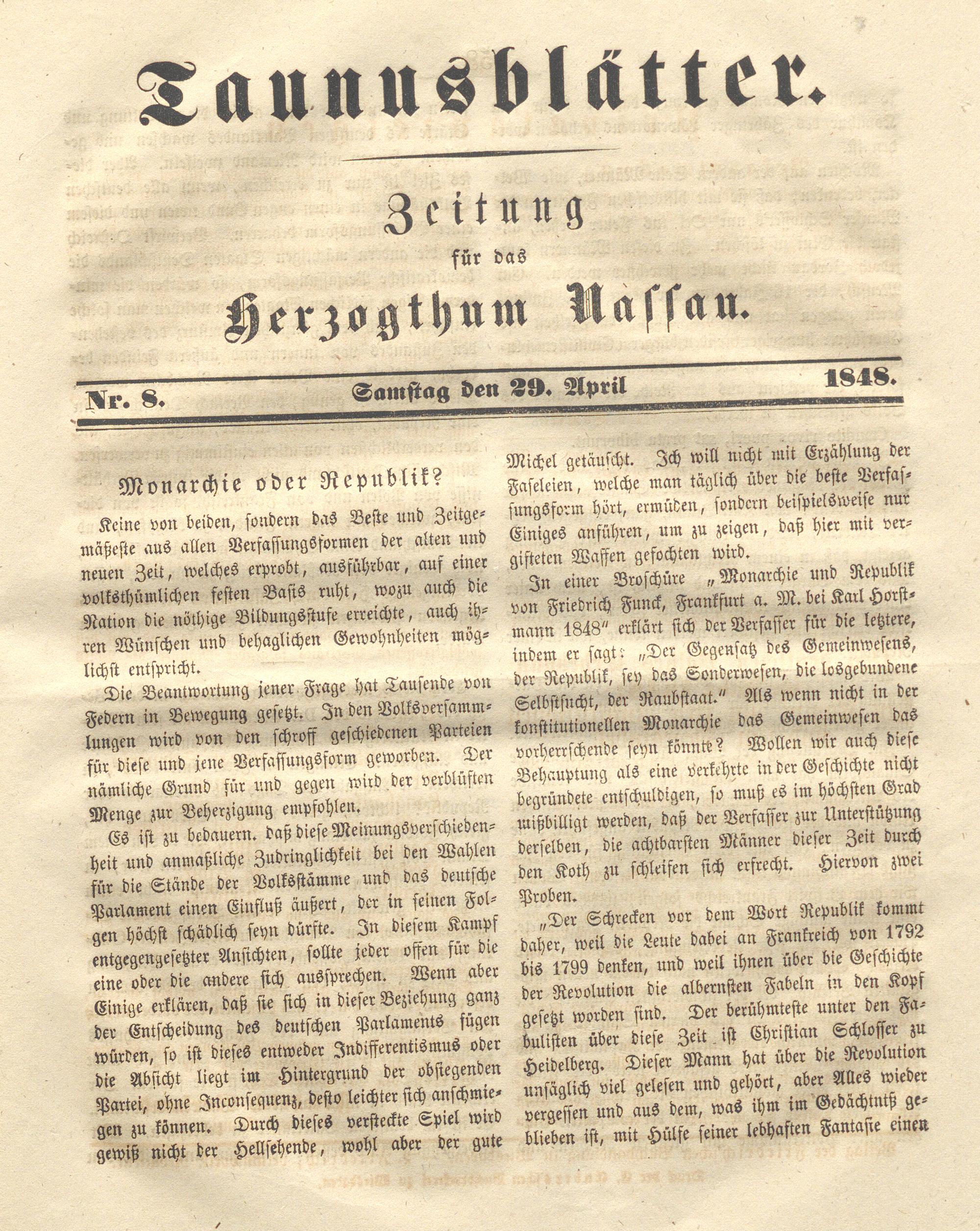 In einer Broschüre „Monarchie und Republik von Friedrich Funck, Frankfurt a. M. bei Karl Horstmann 1848" erklärt sich der Verfasser für die letztere, indem er sagte „Der Gegensatz des Gemeinwesens, der Republik, sey das Sonderwesen, diclosgebundene Selbstsucht, der Raubstaat." Als wenn nicht in der konstitutionellen Monarchie das Gemeinwesen das vorherrschende seyn könnt? ? Wollen wir auch diese Behauptung als eine verkehrte in der Geschichte nicht begründete entschuldigen, so muß es im höchsten Grad mißbilligt werden, daß der Verfasser zur Unterstützung derselben, die achtbarsten Männer dieser Zeit durch den Koth zu schleifen sich erfrecht. Hiervon zwei Proben.