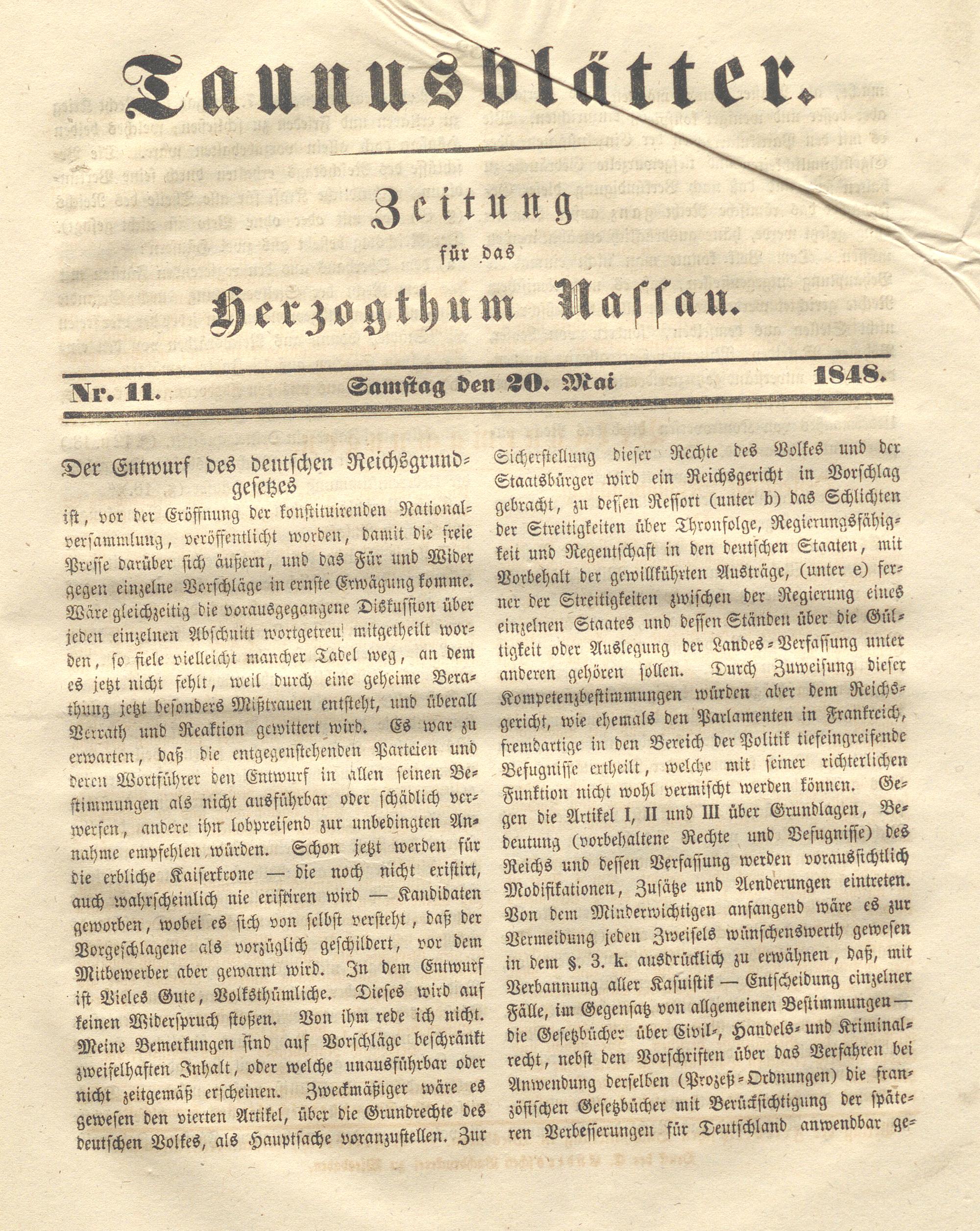 ist, vor der Eröffnung der konftituirenden Nationalversammlung , veröffentlicht worden, damit die freie Presse darüber sich äußern, und das Für und Wider gegen einzelne Vorschläge in ernste Erwägung komme. Wäre gleichzeitig die vorausgegangene Diskussion über jeden einzelnen Abschnitt wortgetreu' mitgetheilt worden , so fiele vielleicht mancher Tadel weg, an dem es jetzt nicht fehlt, weil durch eine geheime Berathung jetzt besonders Mißtrauen entsteht, und überall Verrath und Reakrion gewittert wird. Es war zu erwarten, daß die entgegenstehenden Parteien und deren Wortführer den Entwurf in allen seinen Bestimmungen als nicht ausführbar oder schädlich verwerfen , andere ihn lobpreisend zur unbedingten Annahme empfehlen würden. Schon jetzt werden für die erbliche Kaiserkrone — die noch nicht eriftirt, auch wahrscheinlich nie erismen wird — Kandidaten geworben, wobei es sich von selbst versteht, daß der Vorgeschlagene als vorzüglich geschildert, vor dem Mitbewerber aber gewarnt wird. In dem Entwurf ist Vieles Gute, Volksthümliche. Dieses wird auf keinen Widerspruch stoßen. Von ihm rede ich nicht. Meine Bemerkungen sind auf Vorschläge beschränkt zweifelhaften Inhalt, oder welche unausführbar oder nicht zeitgemäß erscheinen. Zweckmäßiger wäre eS gewesen den vierten Artikel, über die Grundrechte des deutschen Volkes, als Hauptsache voranzustellen. Zur