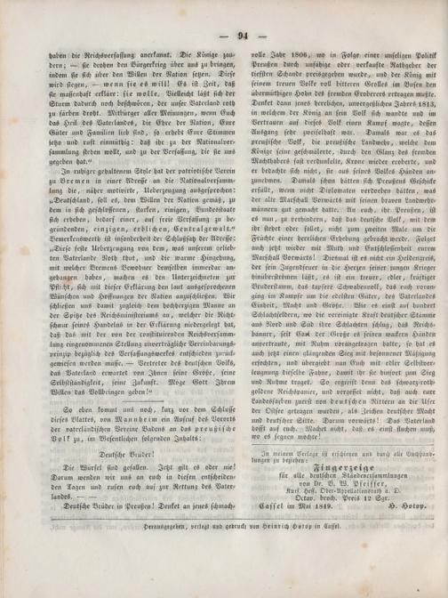 Blätter des Nationalen Vereins für Deutschland. 1849-1849