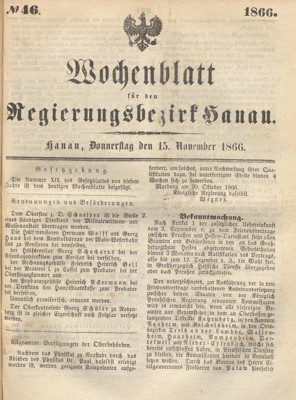 Wochenblatt für den Regierungsbezirk Hanau. 1866-1867