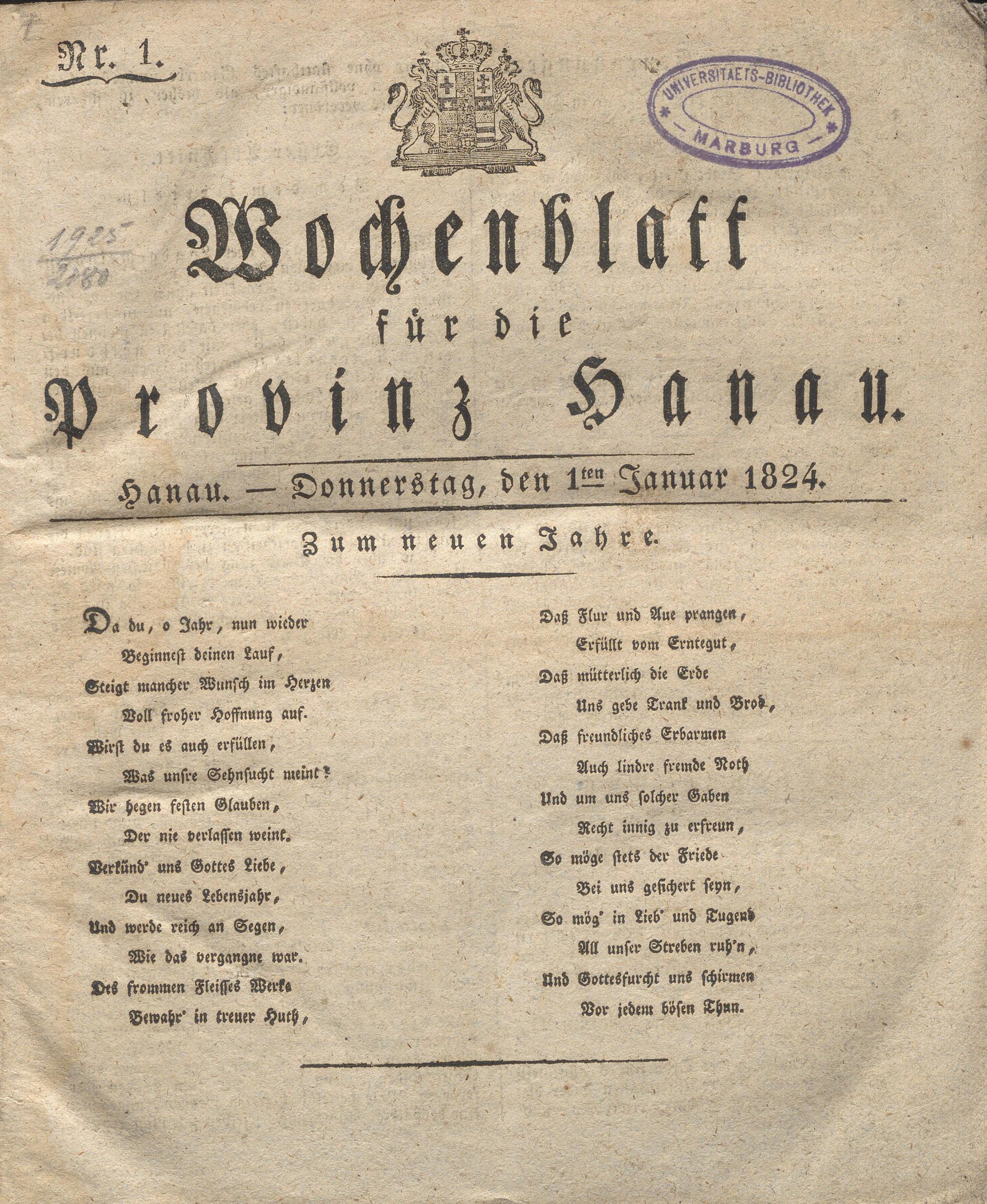 Wochenblatt für die Provinz Hanau. 1822-1849