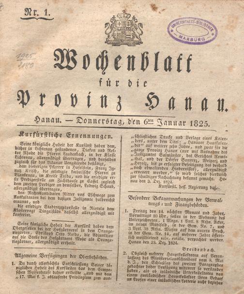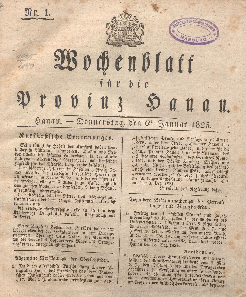 Wochenblatt für die Provinz Hanau. 1822-1849