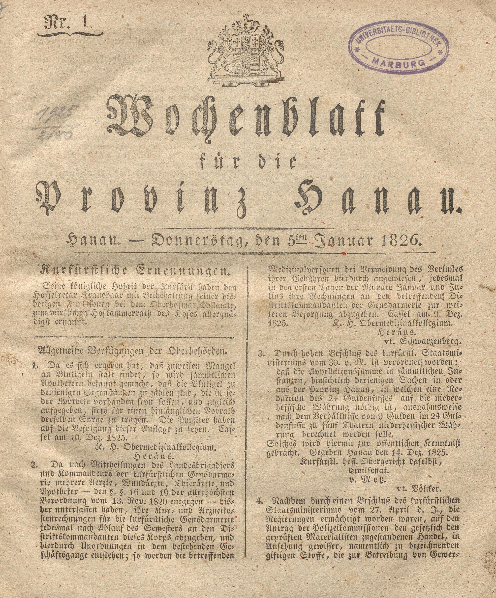 Wochenblatt für die Provinz Hanau. 1822-...