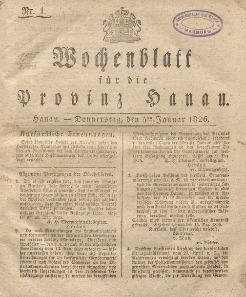 Wochenblatt für die Provinz Hanau. 1822-1849