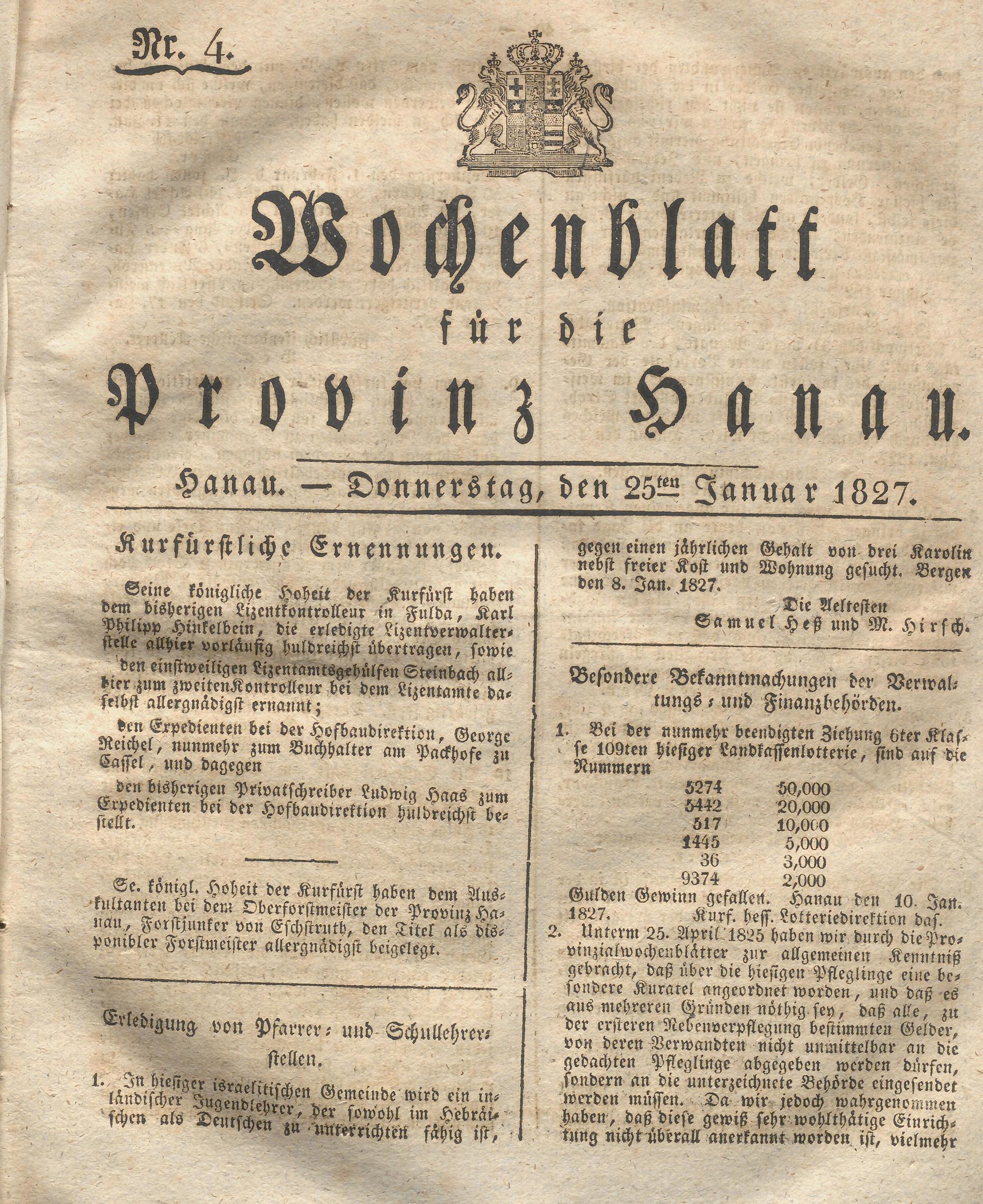 Wochenblatt für die Provinz Hanau. 1822-1849