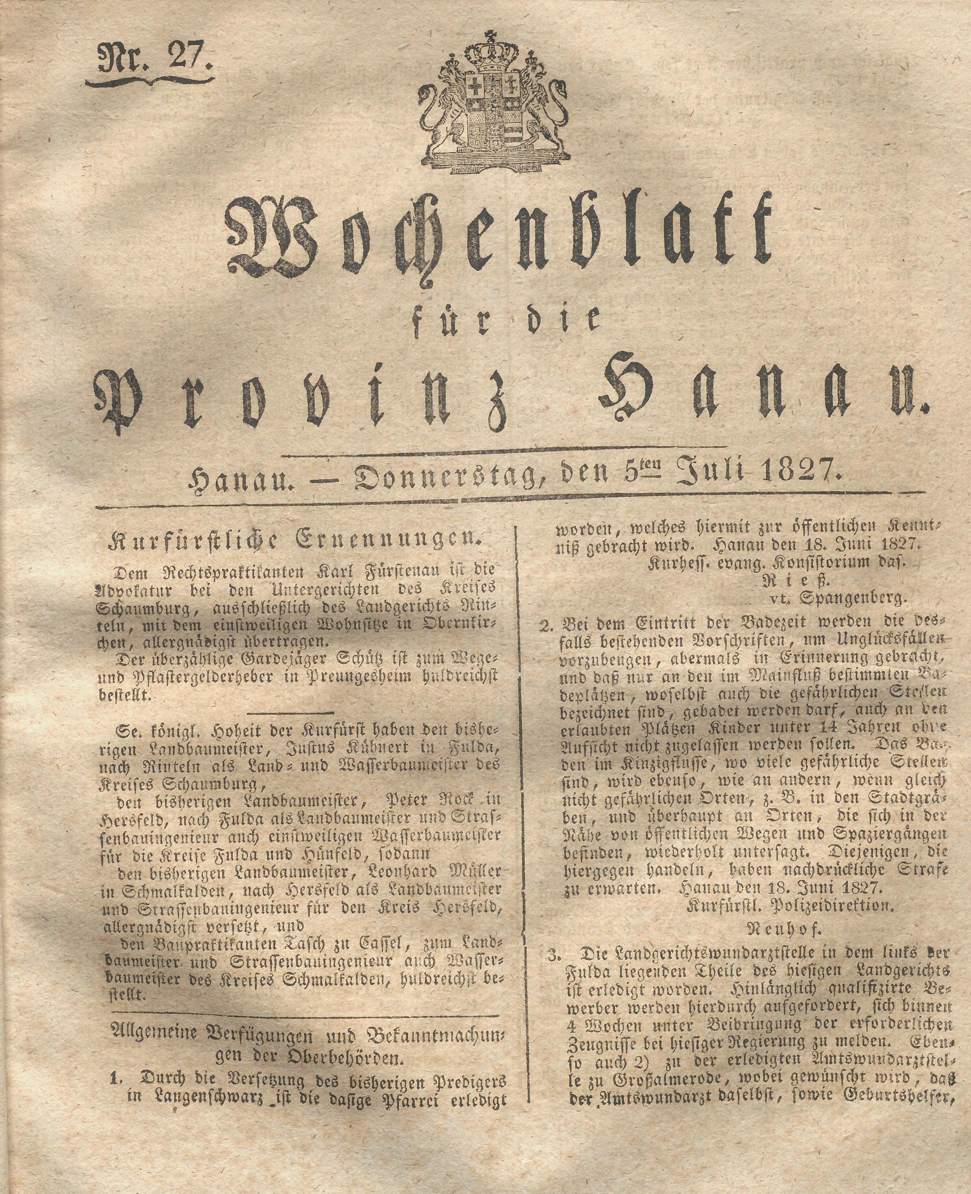 Wochenblatt für die Provinz Hanau. 1822-1849
