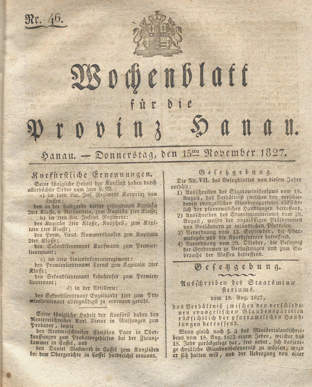 Wochenblatt für die Provinz Hanau. 1822-1849