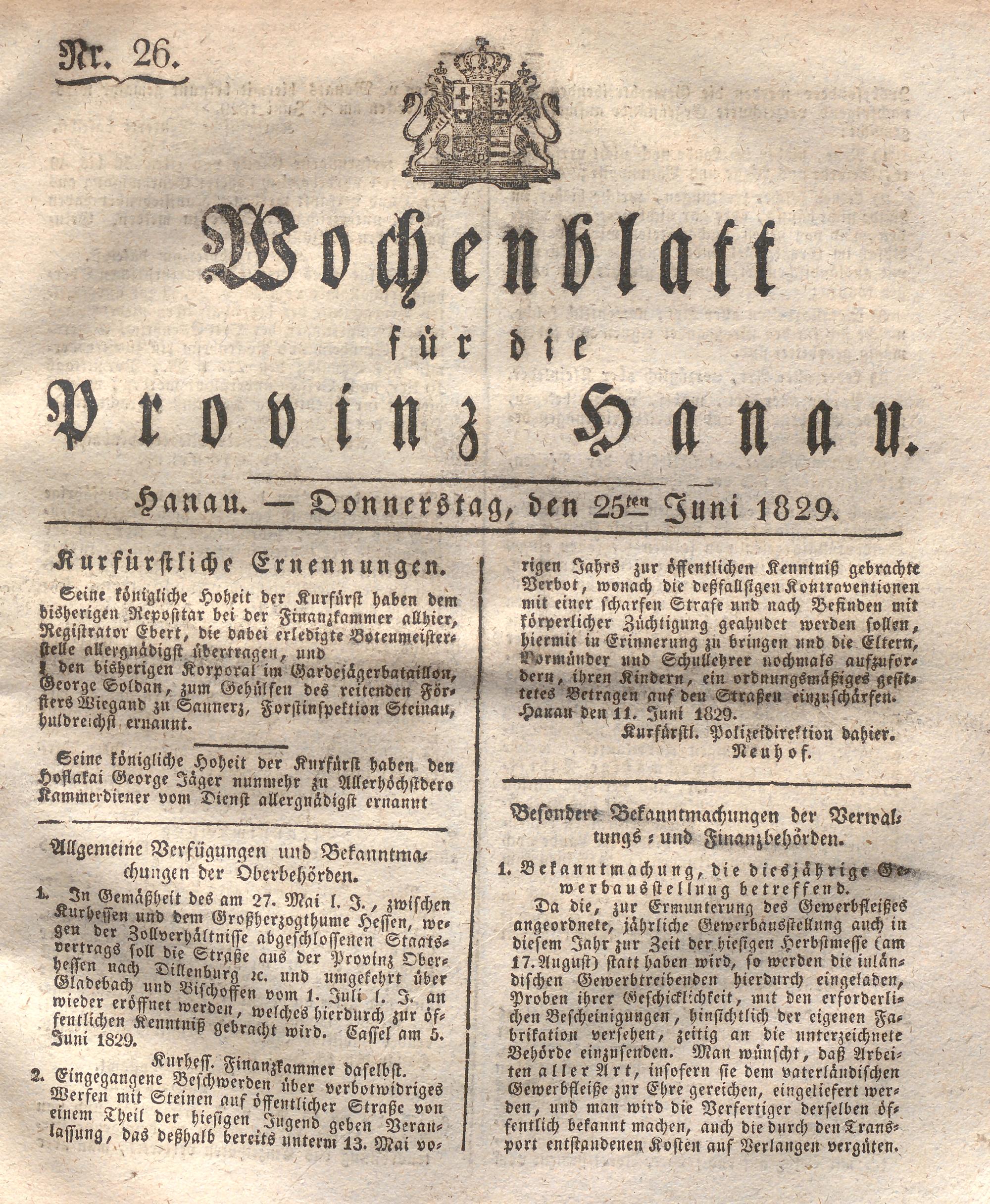 Wochenblatt für die Provinz Hanau. 1822-1849