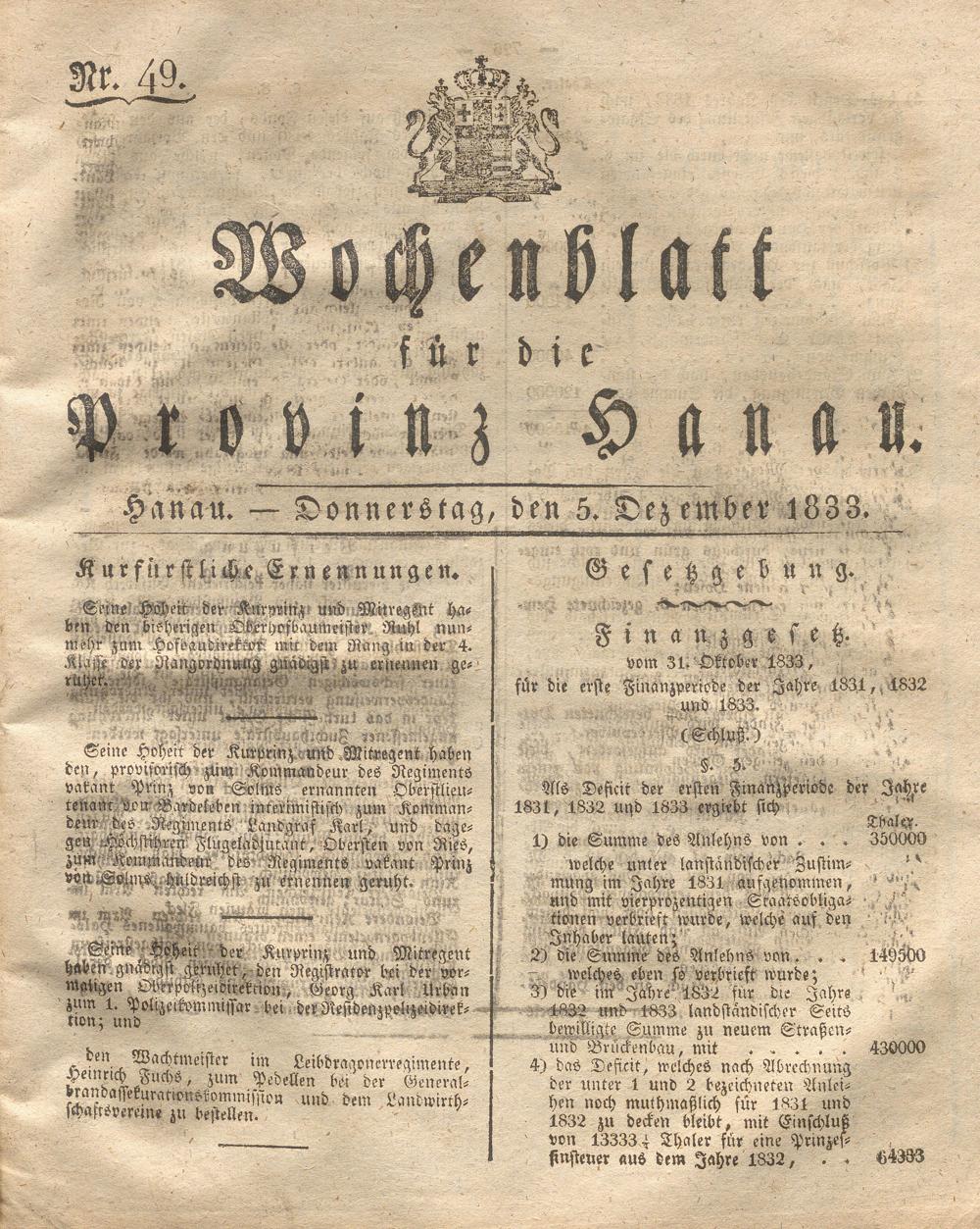 Wochenblatt für die Provinz Hanau. 1822-1849