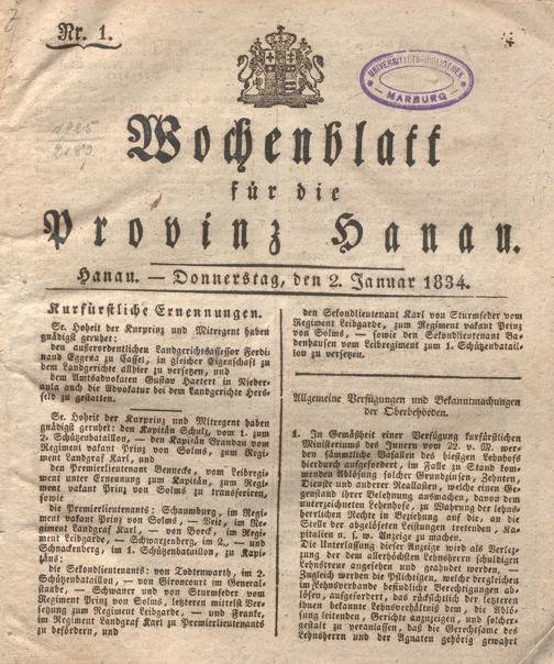 Wochenblatt für die Provinz Hanau. 1822-1849