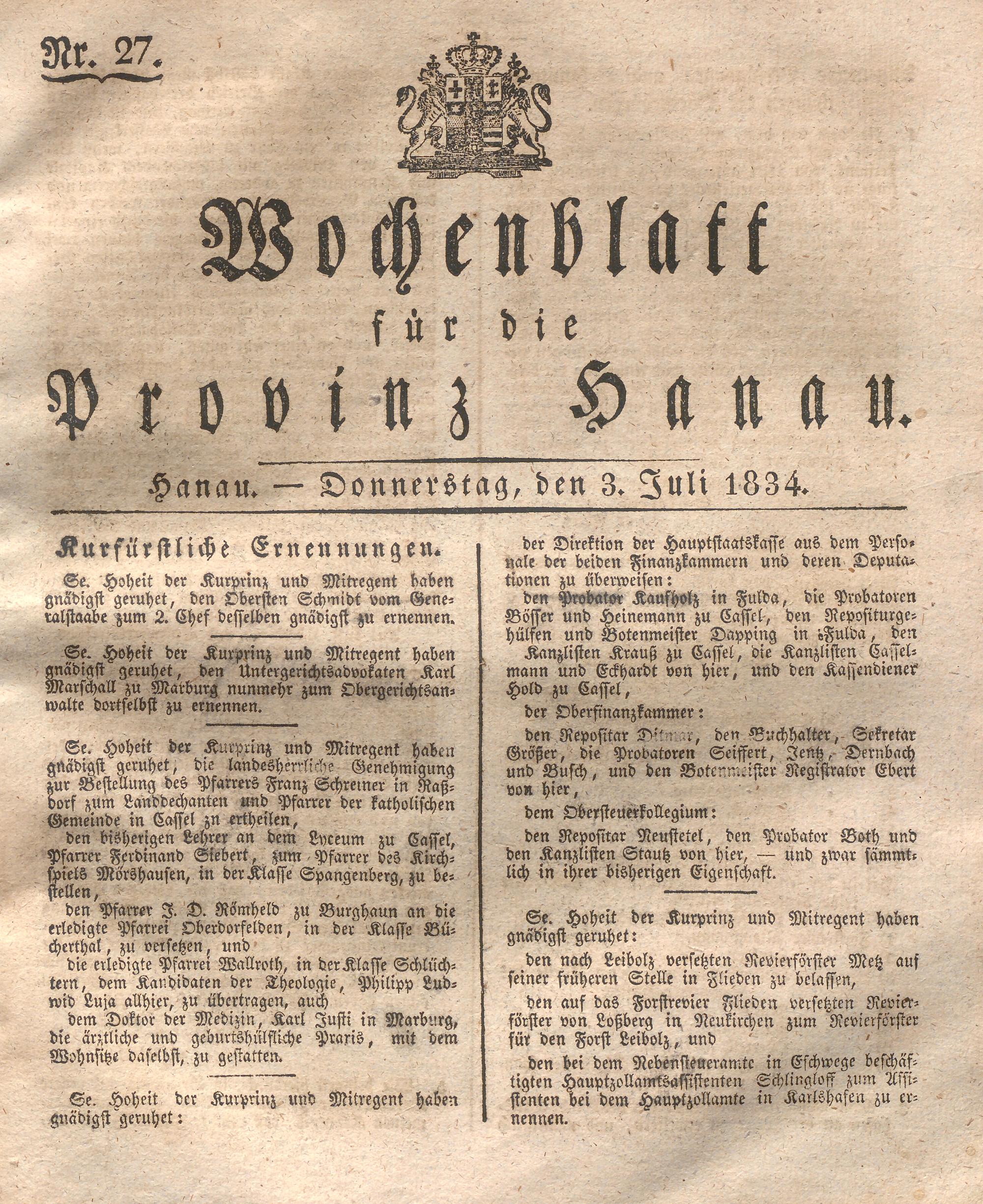 Wochenblatt für die Provinz Hanau. 1822-1849