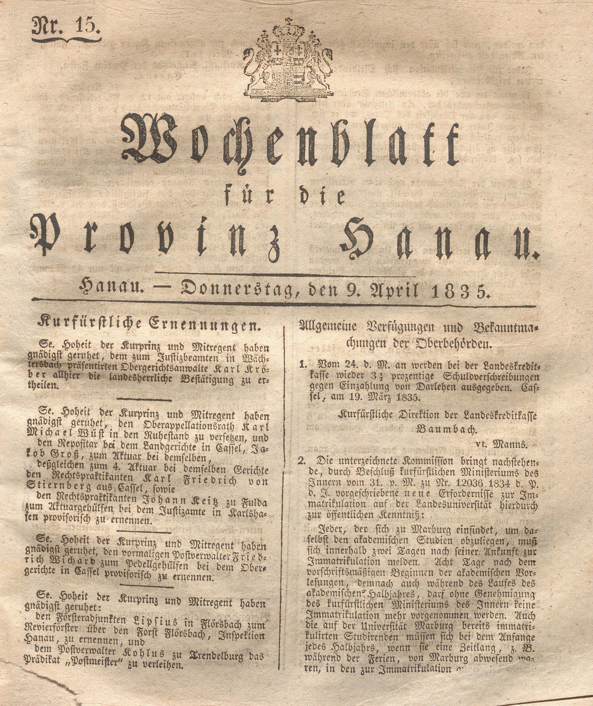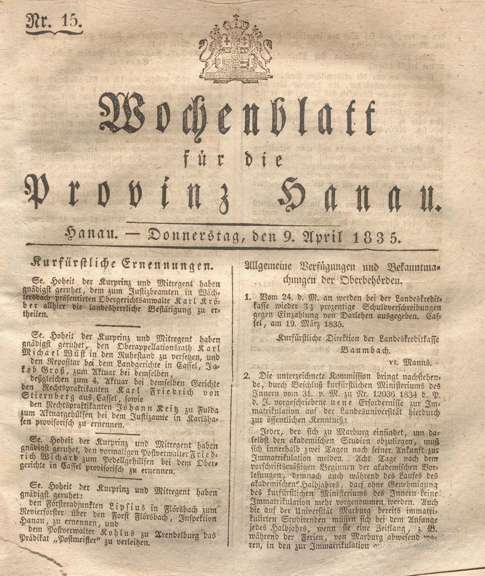 Wochenblatt für die Provinz Hanau. 1822-1849
