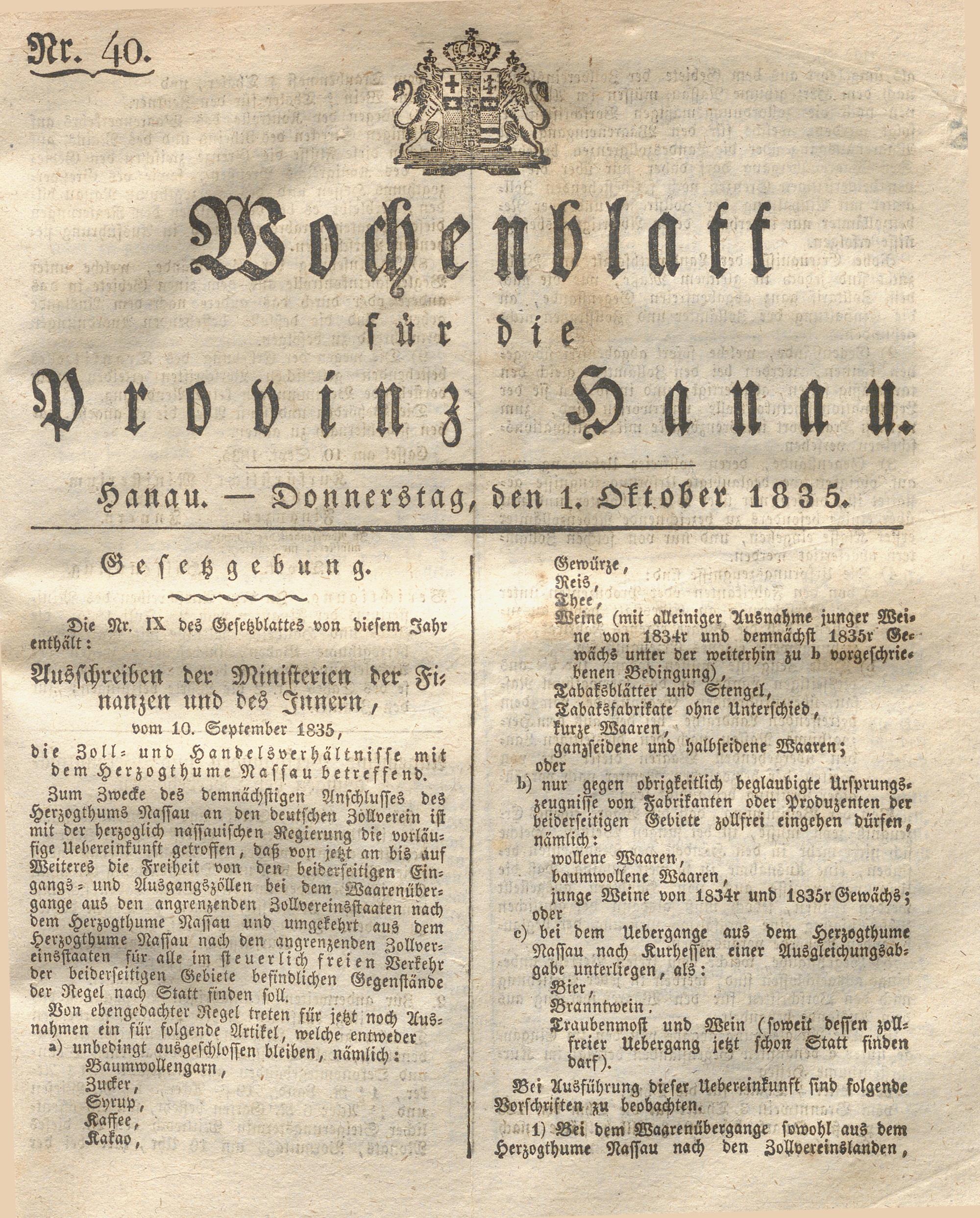 Wochenblatt für die Provinz Hanau. 1822-1849