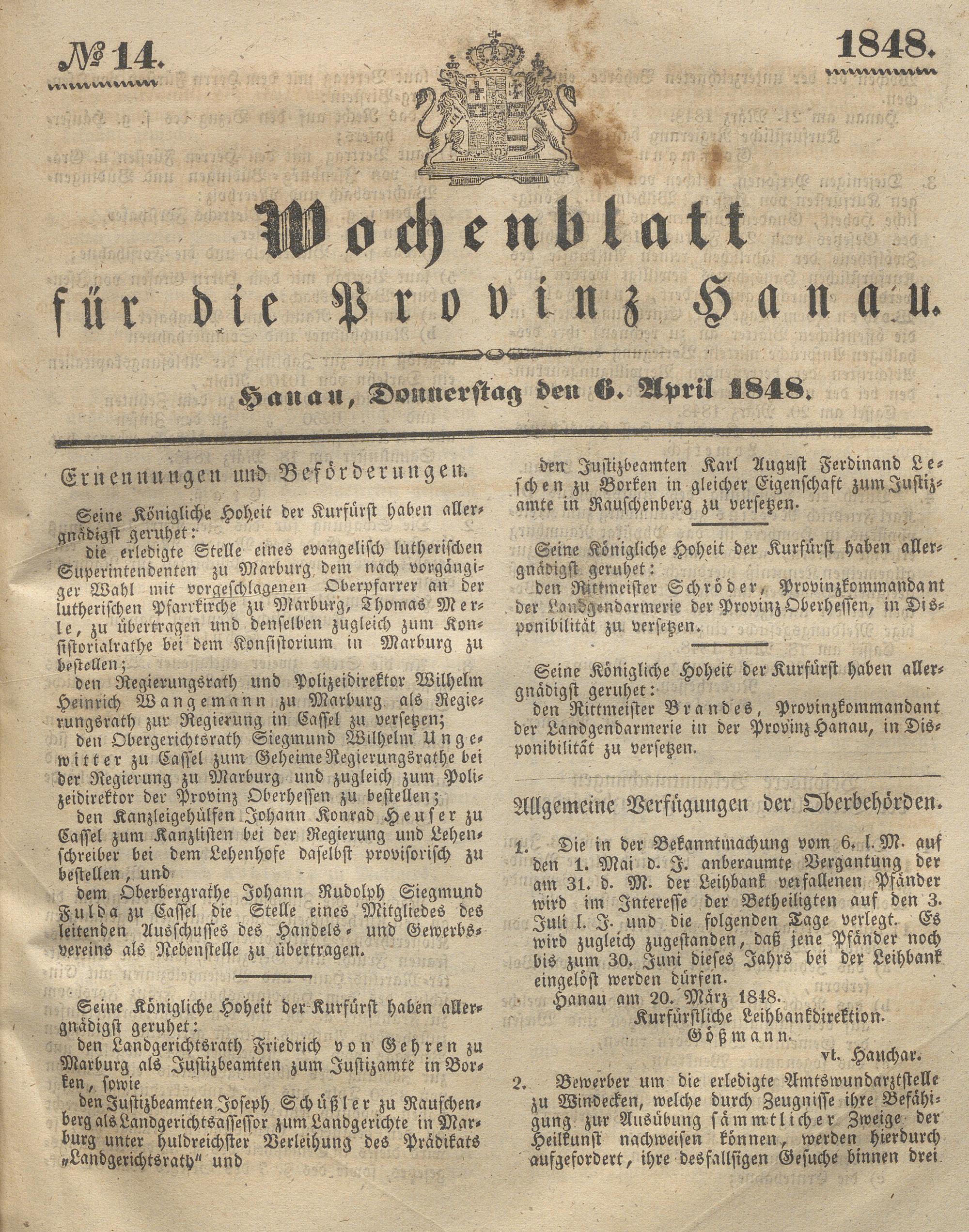 Wochenblatt für die Provinz Hanau. 1822-1849