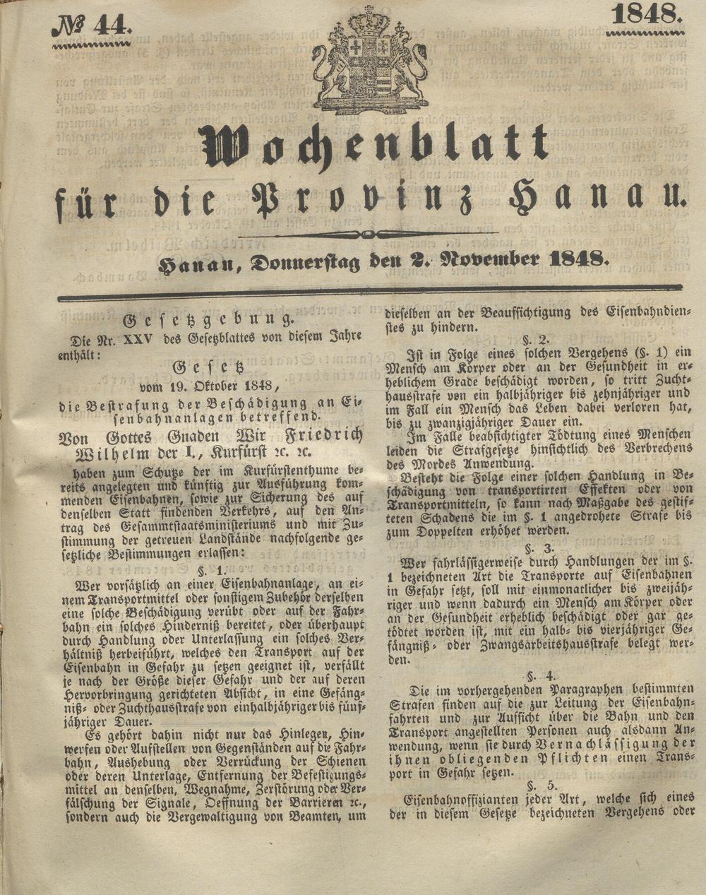 Wochenblatt für die Provinz Hanau. 1822-1849