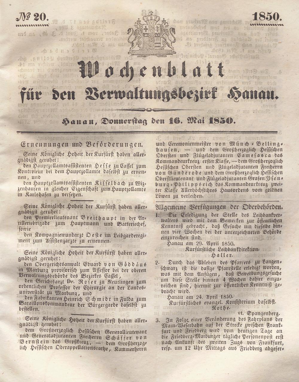 Wochenblatt für den Verwaltungsbezirk Hanau. 1849-1851