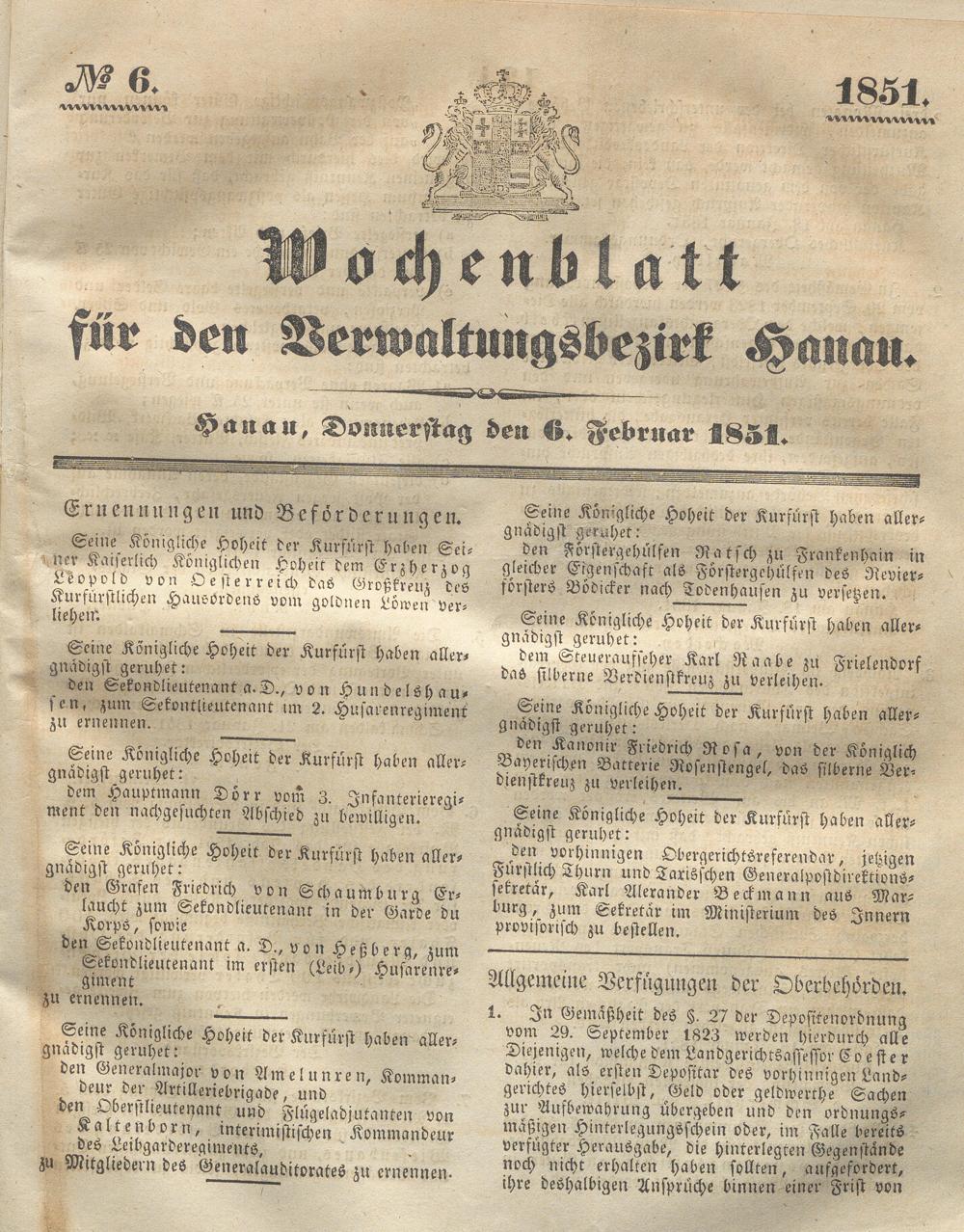 Wochenblatt für den Verwaltungsbezirk Hanau. 1849-1851