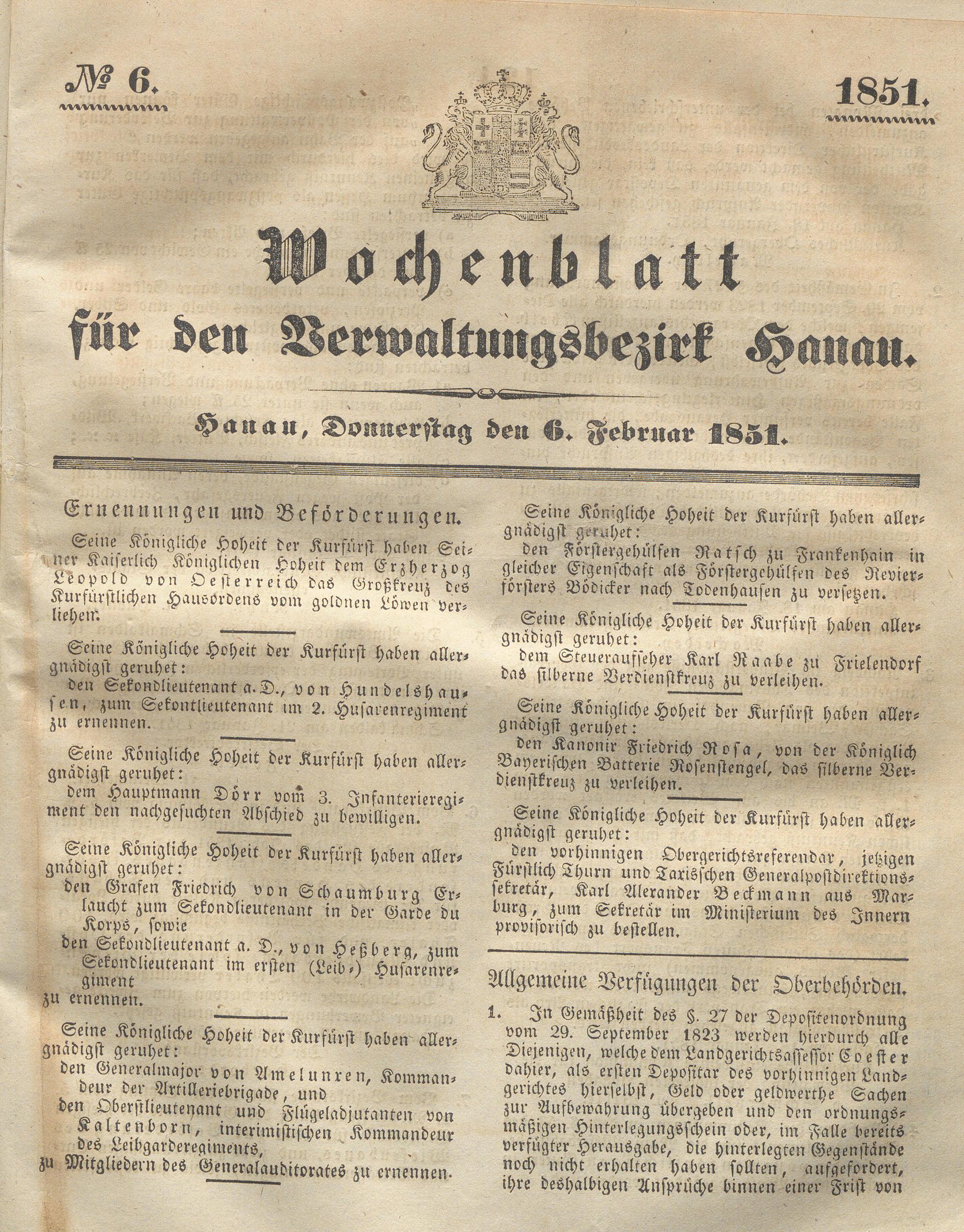 Wochenblatt für den Verwaltungsbezirk Hanau....