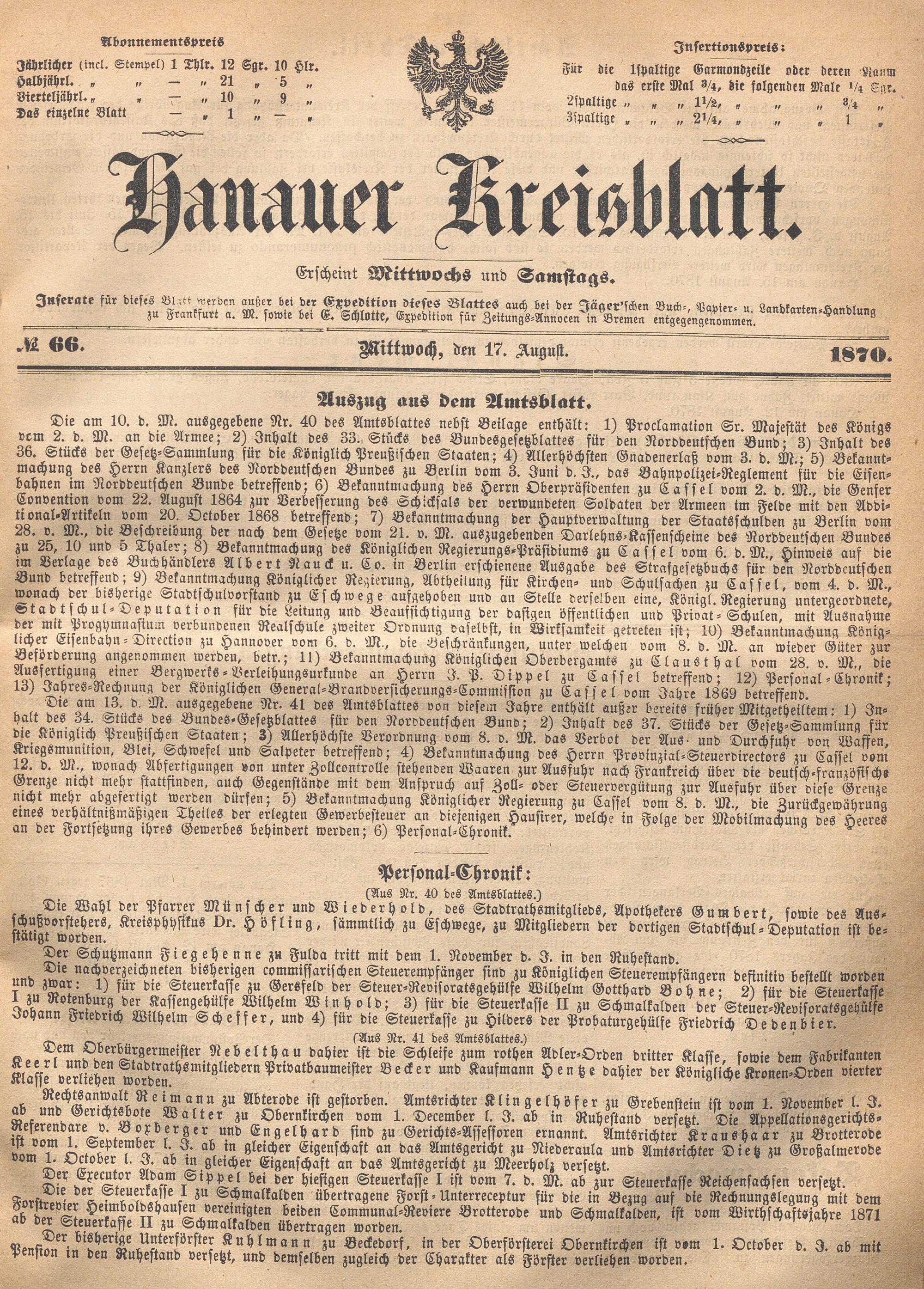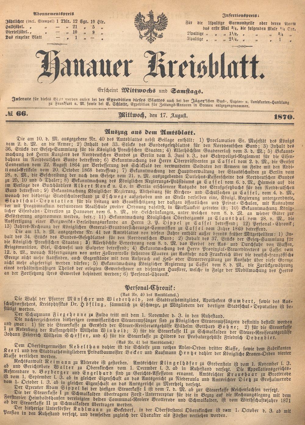 Hanauer Kreisblatt. 1870-1871