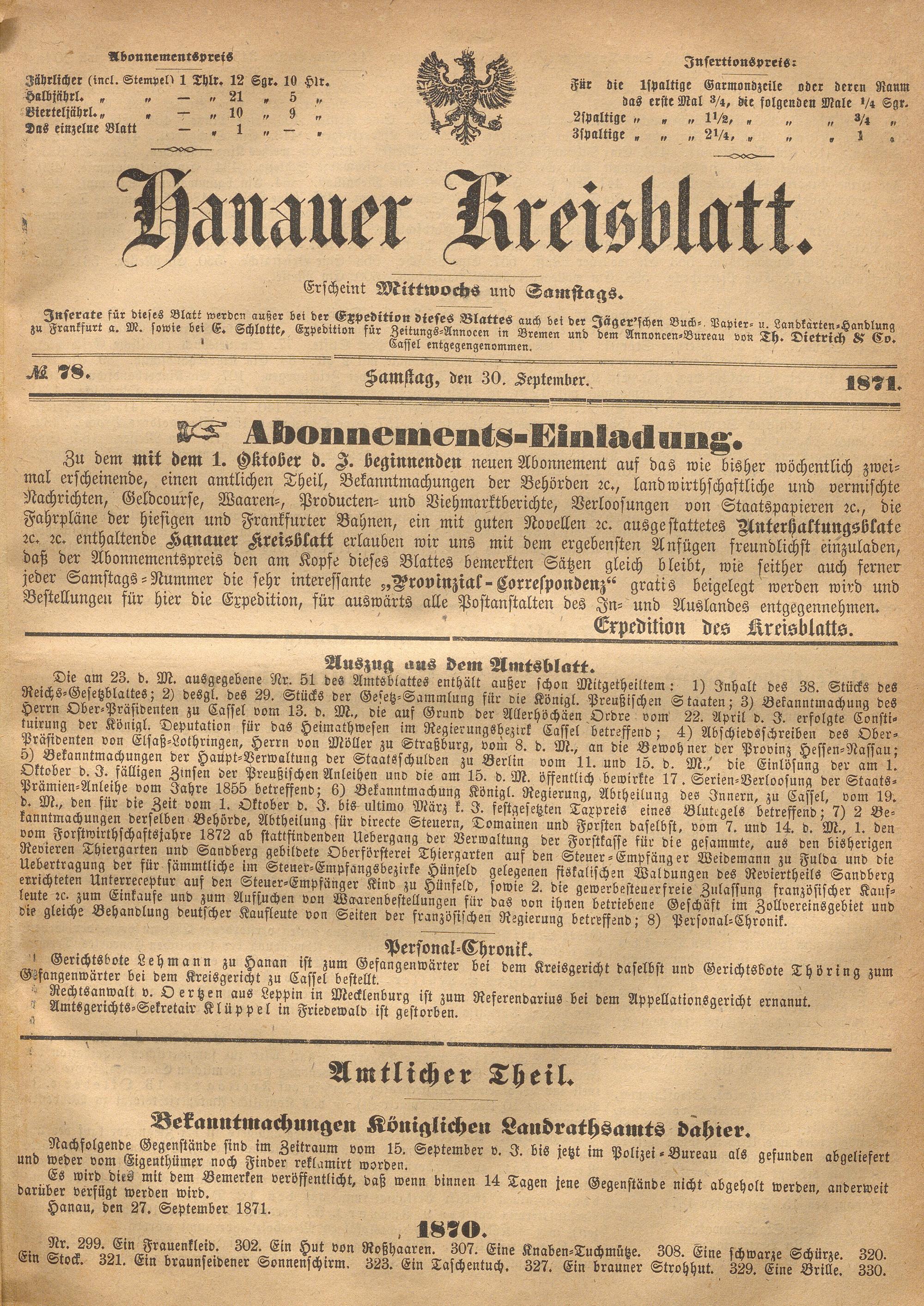 Hanauer Kreisblatt. 1870-1871