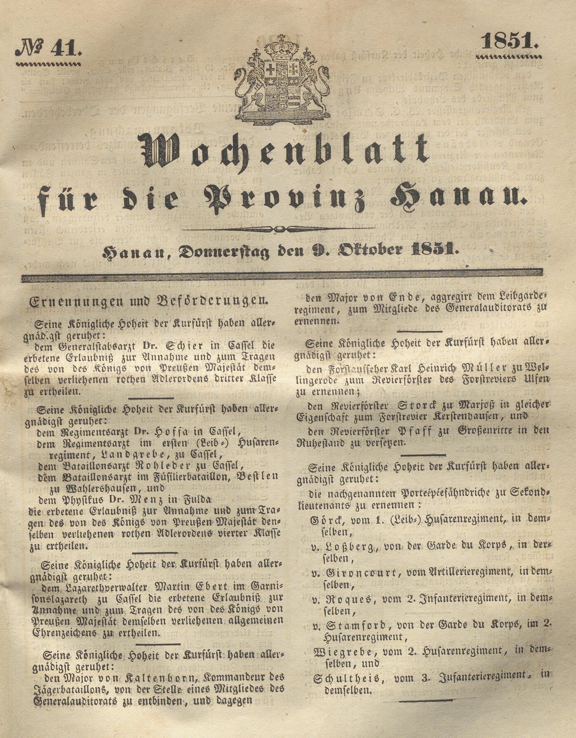 Wochenblatt für die Provinz Hanau. 1851-1866