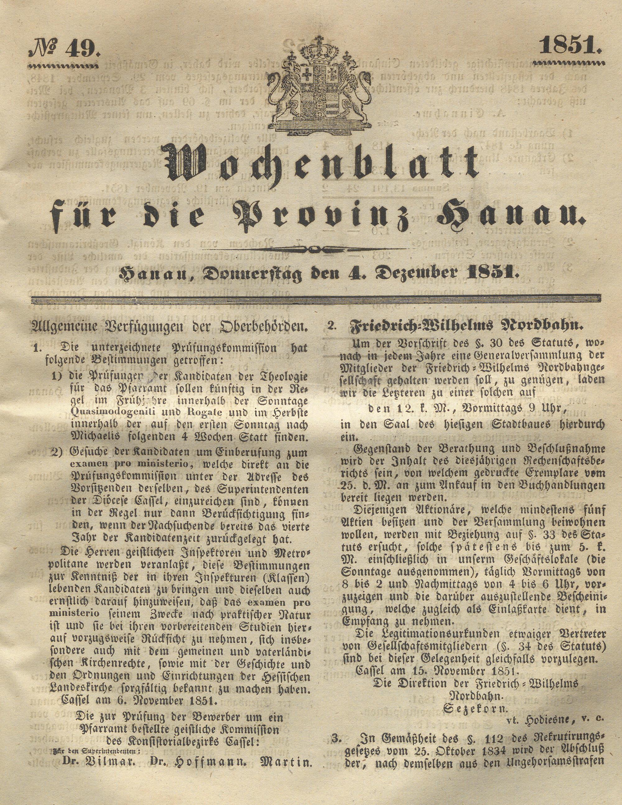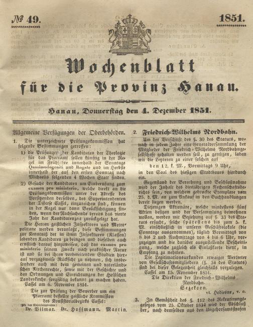 Wochenblatt für die Provinz Hanau. 1851-1866