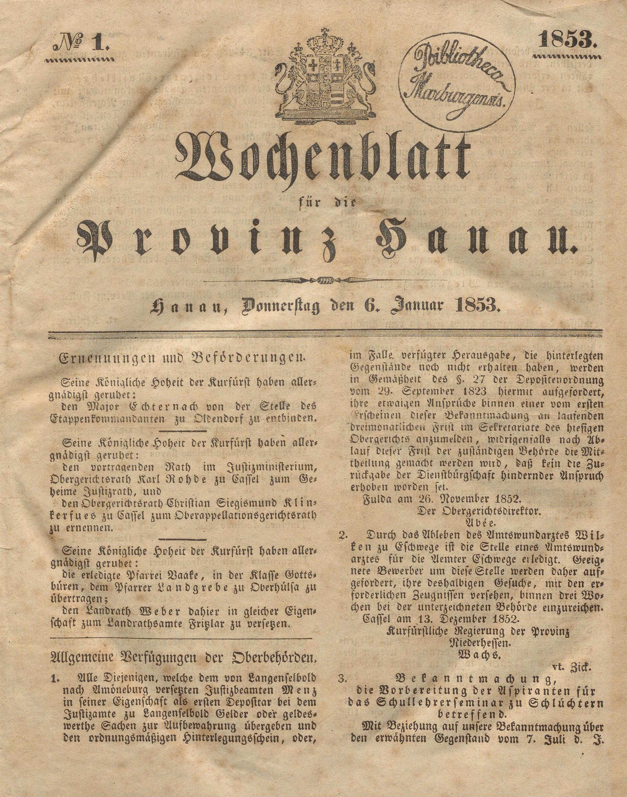 Wochenblatt für die Provinz Hanau. 1851-1866