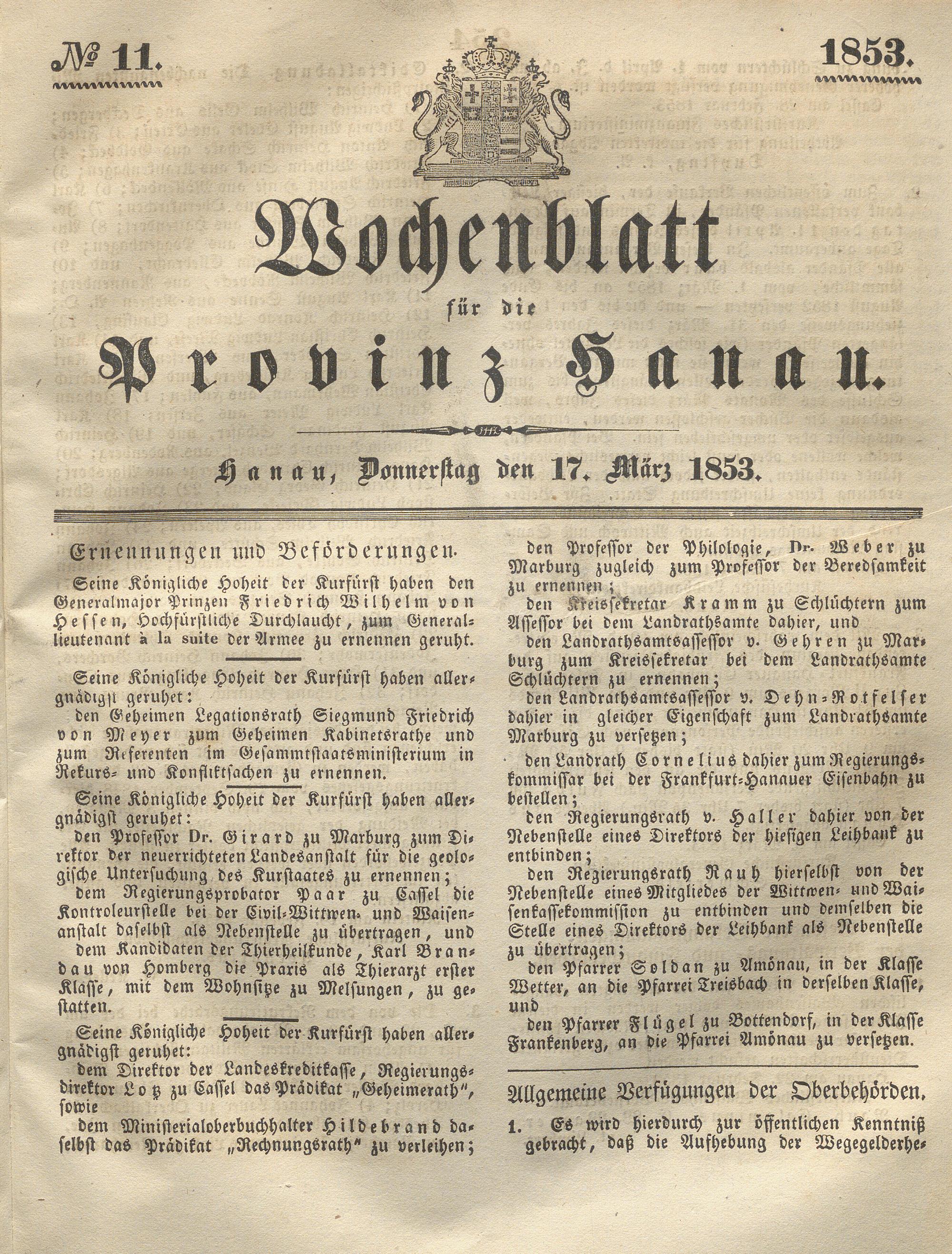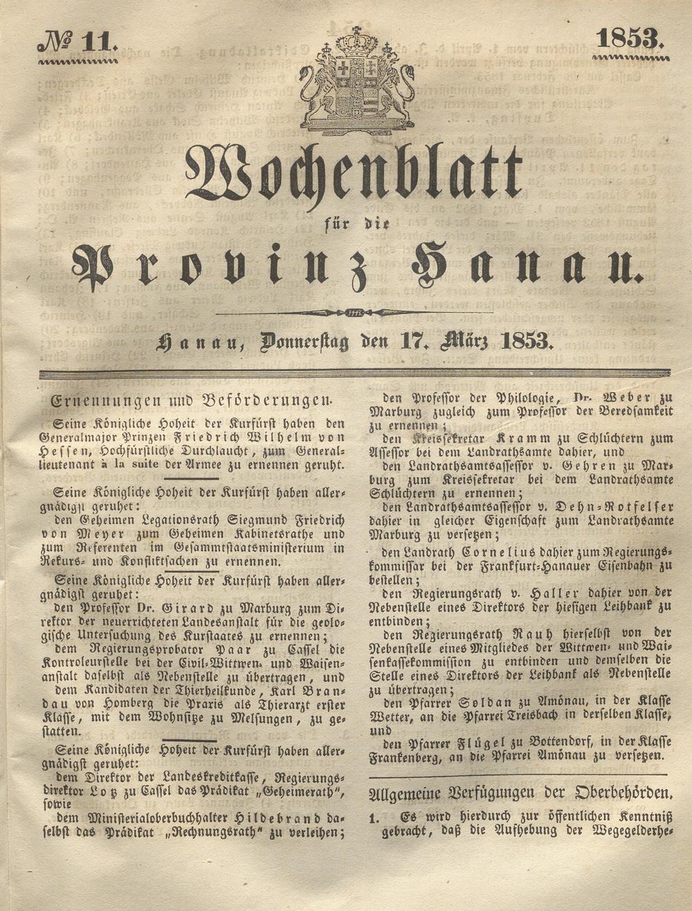 Wochenblatt für die Provinz Hanau. 1851-1866