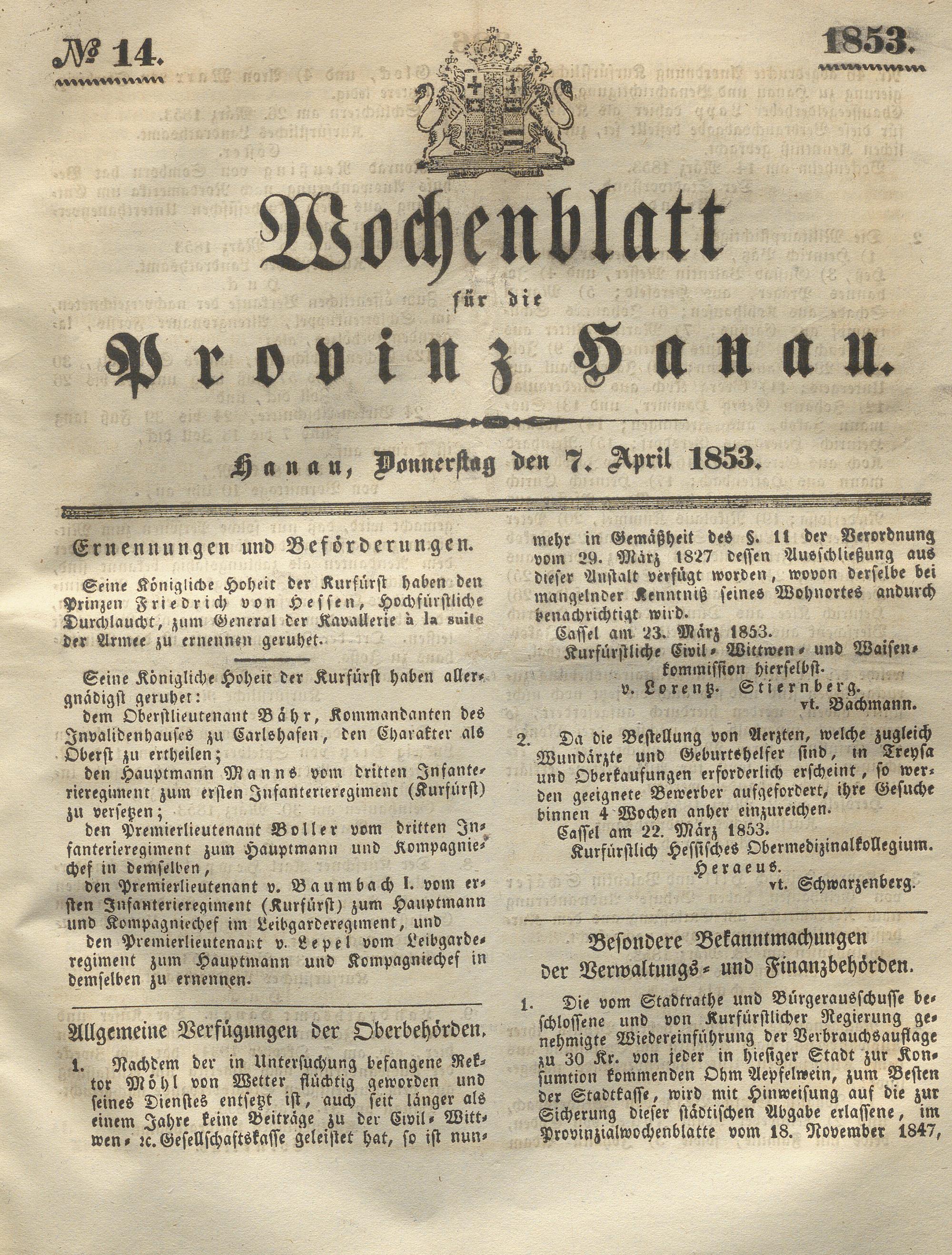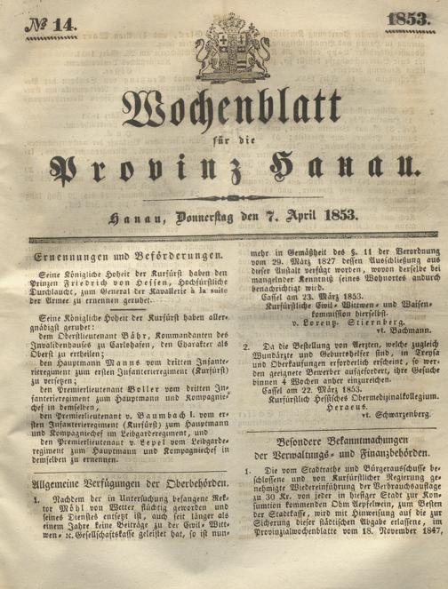 Wochenblatt für die Provinz Hanau. 1851-1866