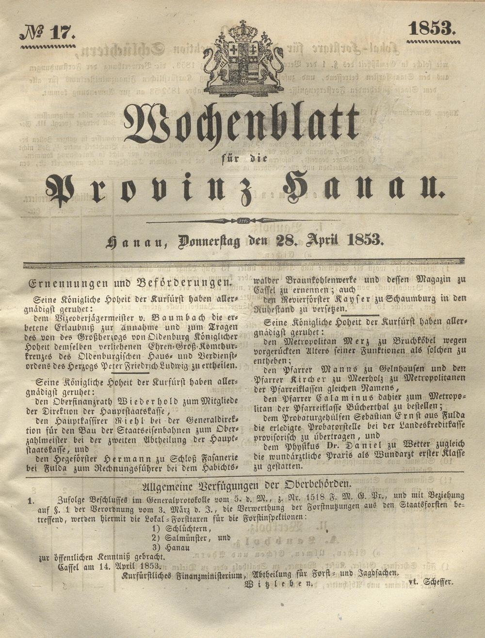 Wochenblatt für die Provinz Hanau. 1851-1866