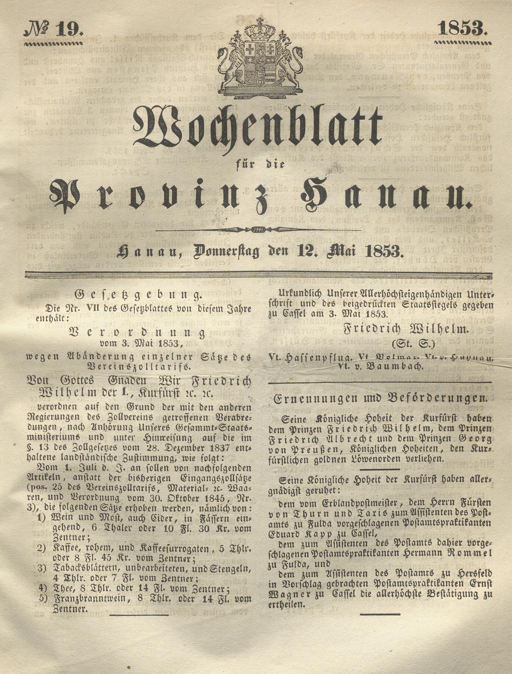 Wochenblatt für die Provinz Hanau. 1851-1866