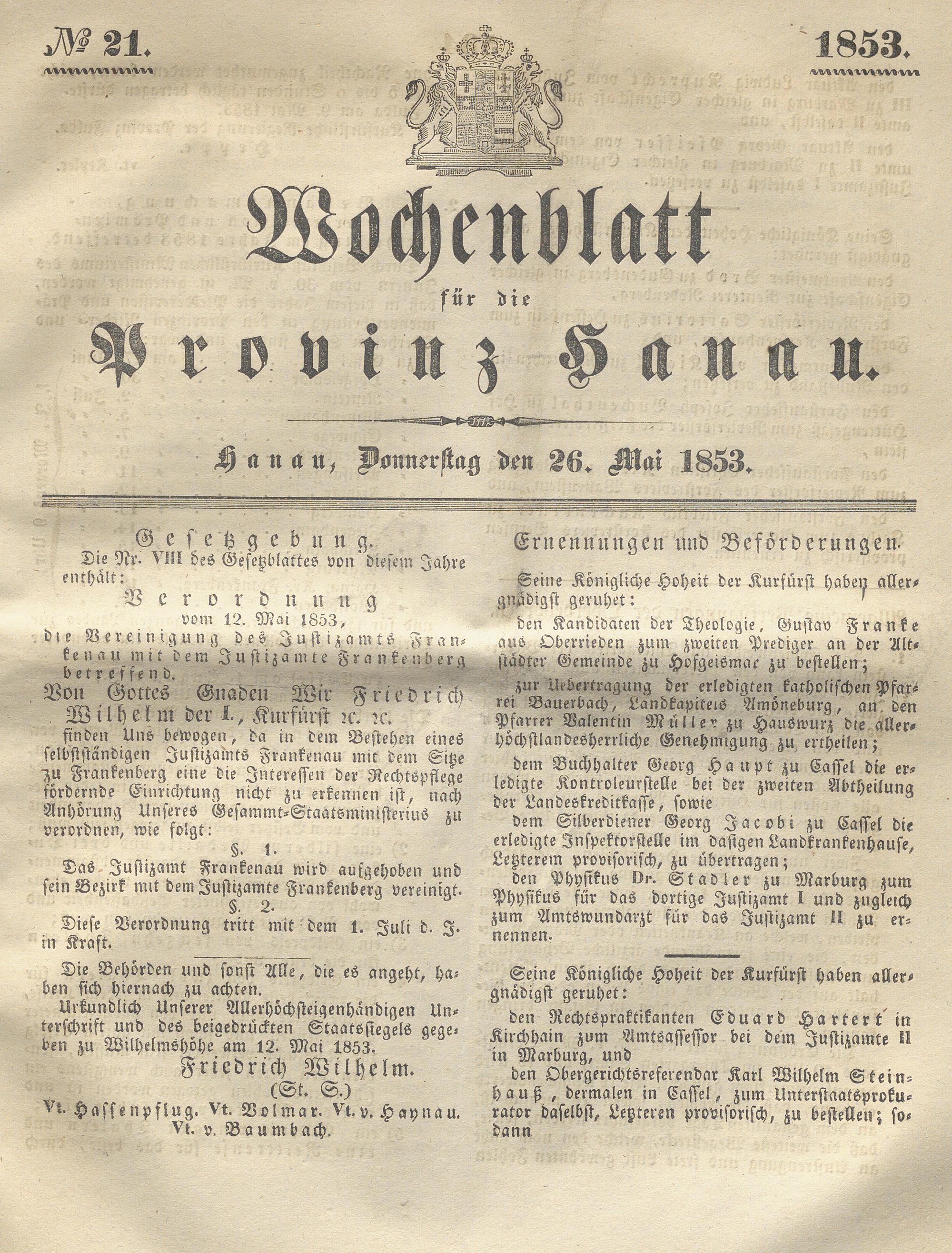 Wochenblatt für die Provinz Hanau. 1851-1866