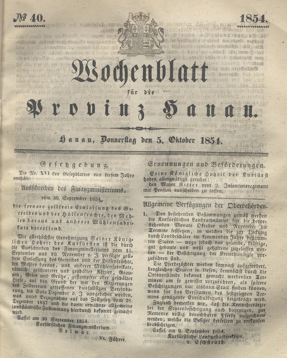 Wochenblatt für die Provinz Hanau. 1851-1866