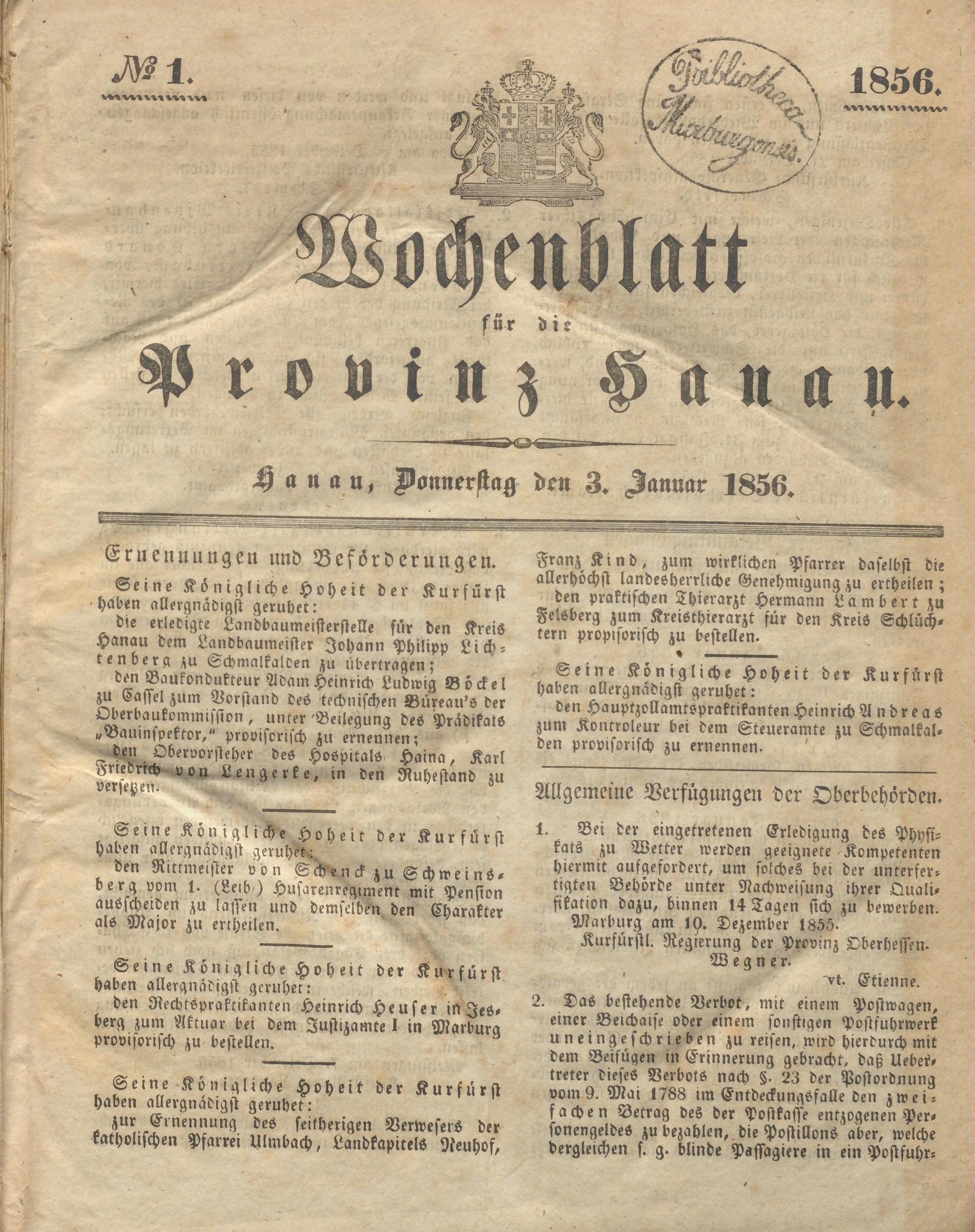 Wochenblatt für die Provinz Hanau. 1851-...