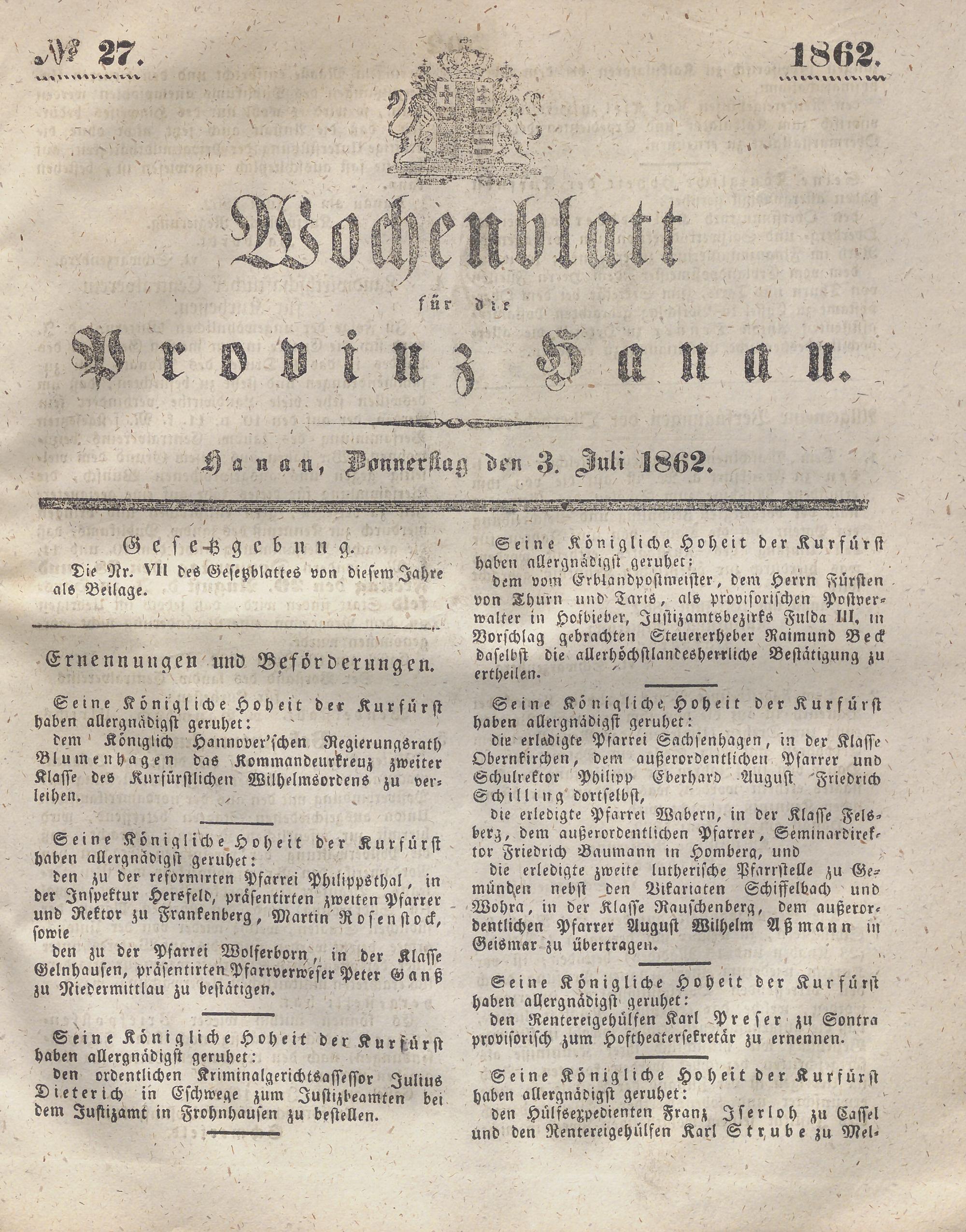 Wochenblatt für die Provinz Hanau. 1851-1866