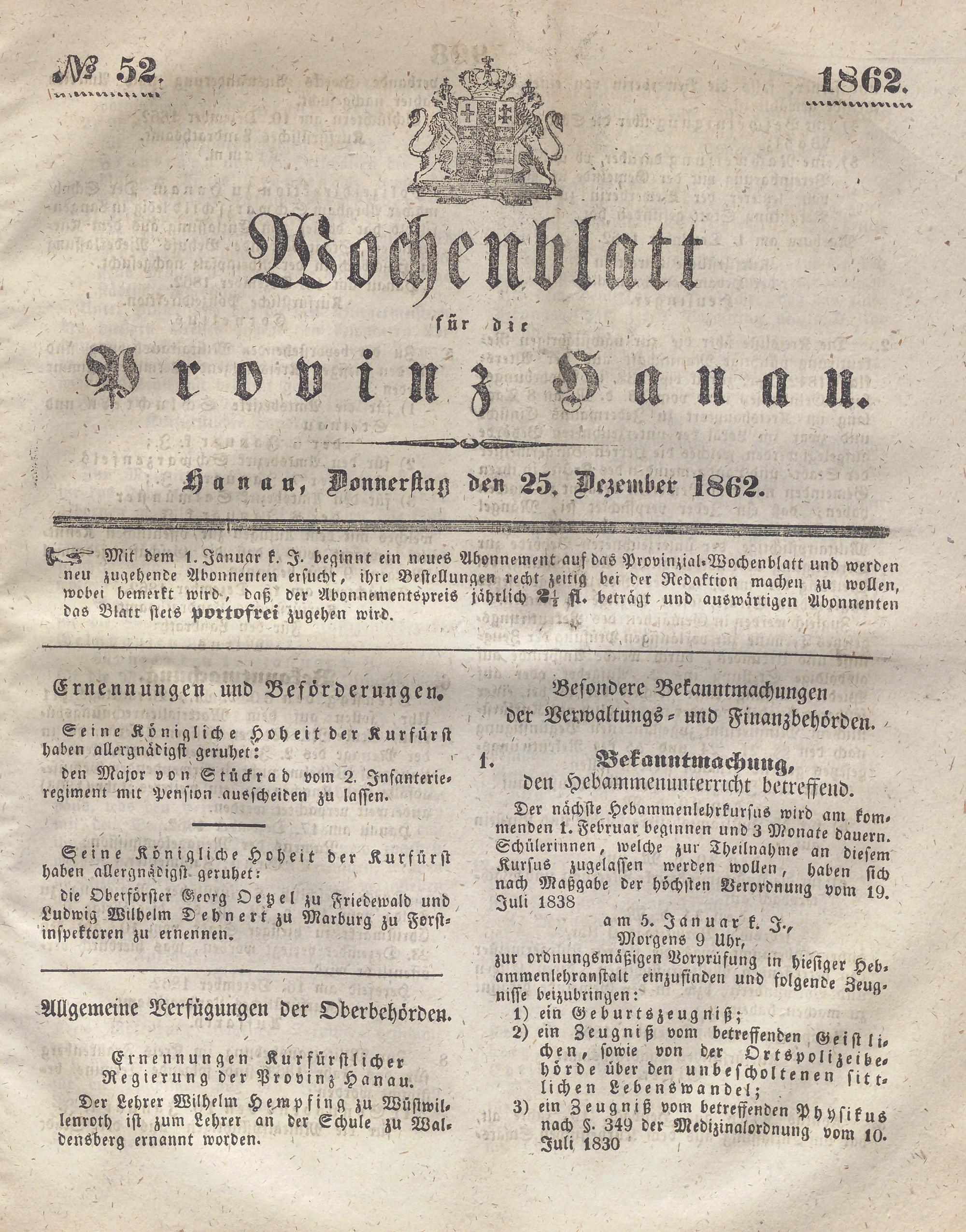 Wochenblatt für die Provinz Hanau. 1851-1866