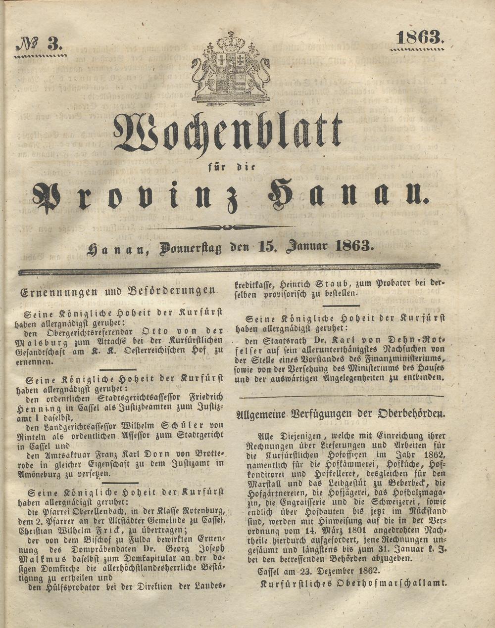 Wochenblatt für die Provinz Hanau. 1851-1866