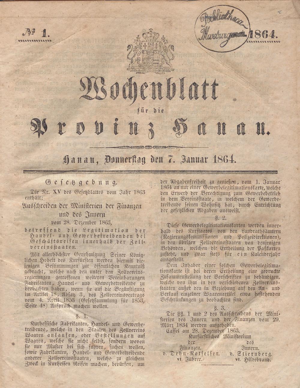 Wochenblatt für die Provinz Hanau. 1851-1866