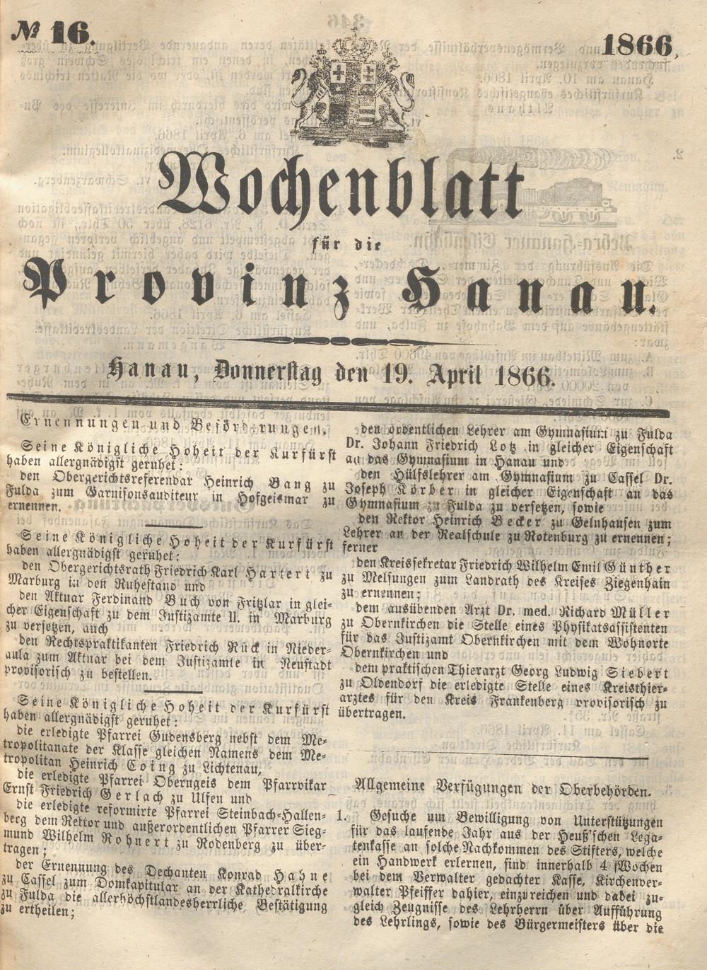 Wochenblatt für die Provinz Hanau. 1851-1866
