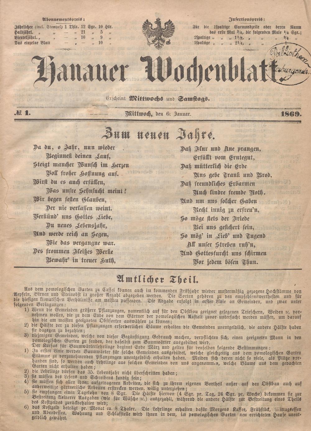Hanauer Wochenblatt. 1869-1869
