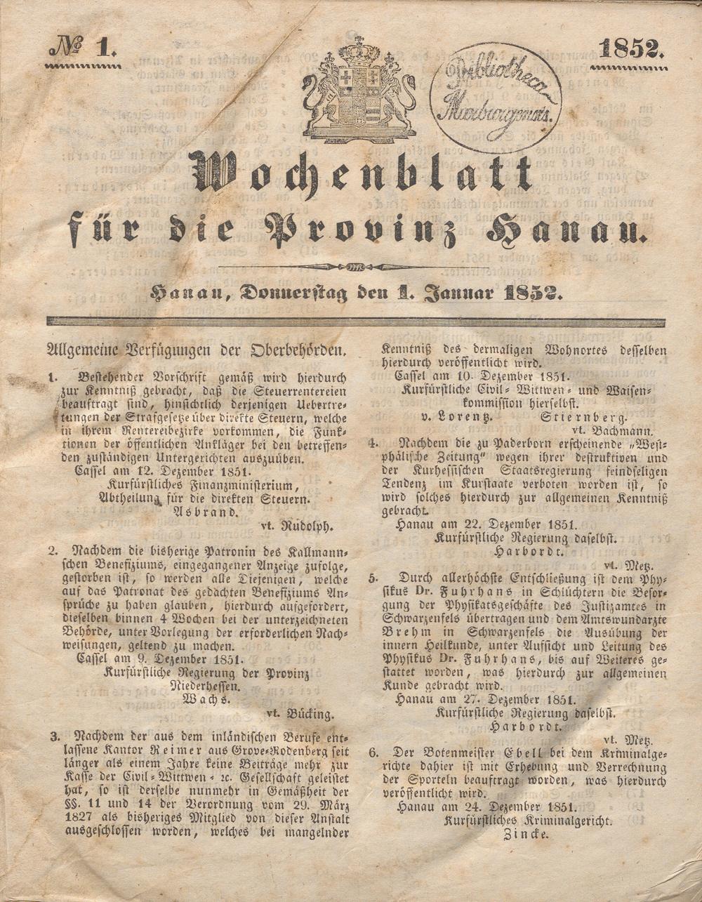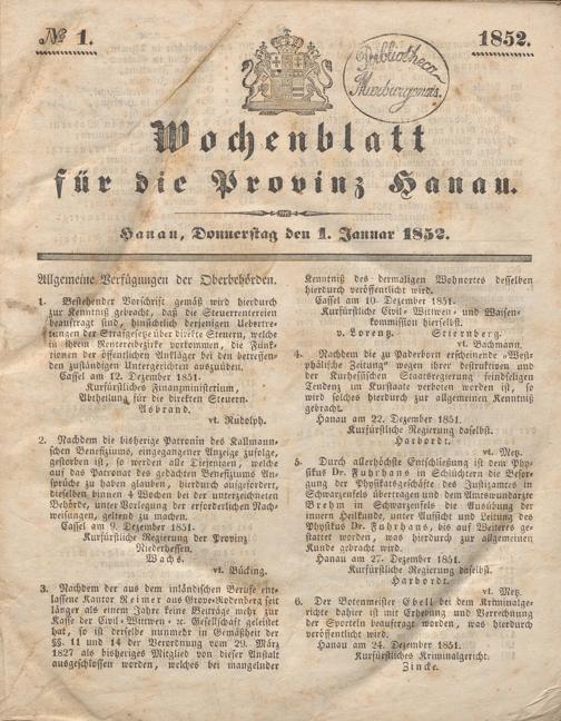 Wochenblatt für die Provinz Hanau. 1851-1866