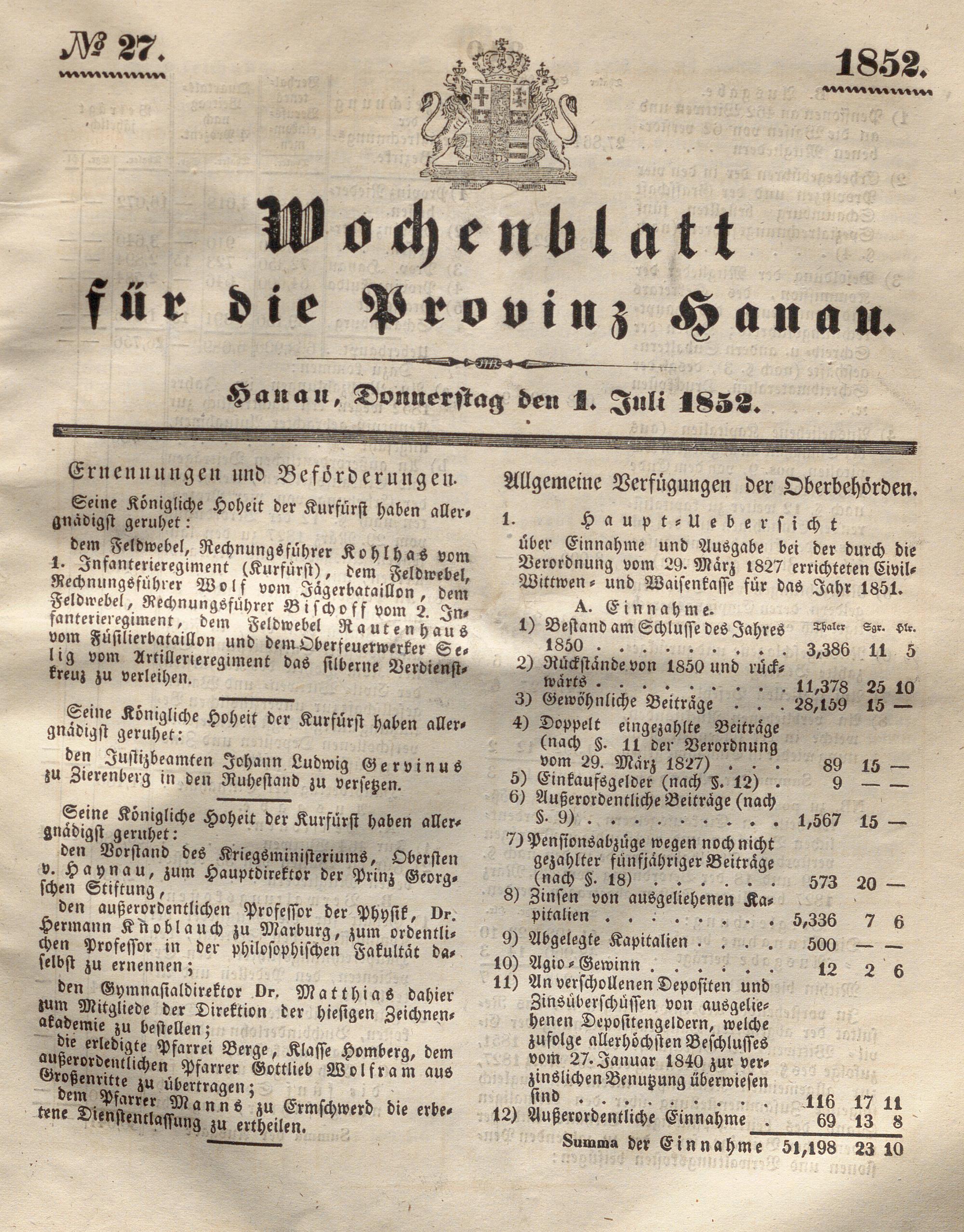 Wochenblatt für die Provinz Hanau. 1851-1866