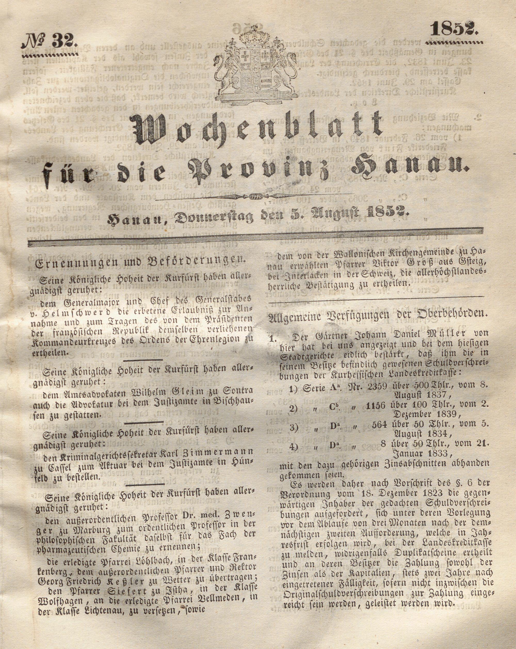 Wochenblatt für die Provinz Hanau. 1851-1866