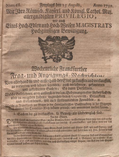 Wochentliche Franckfurter Frag- und Anzeigungs-Nachrichten....