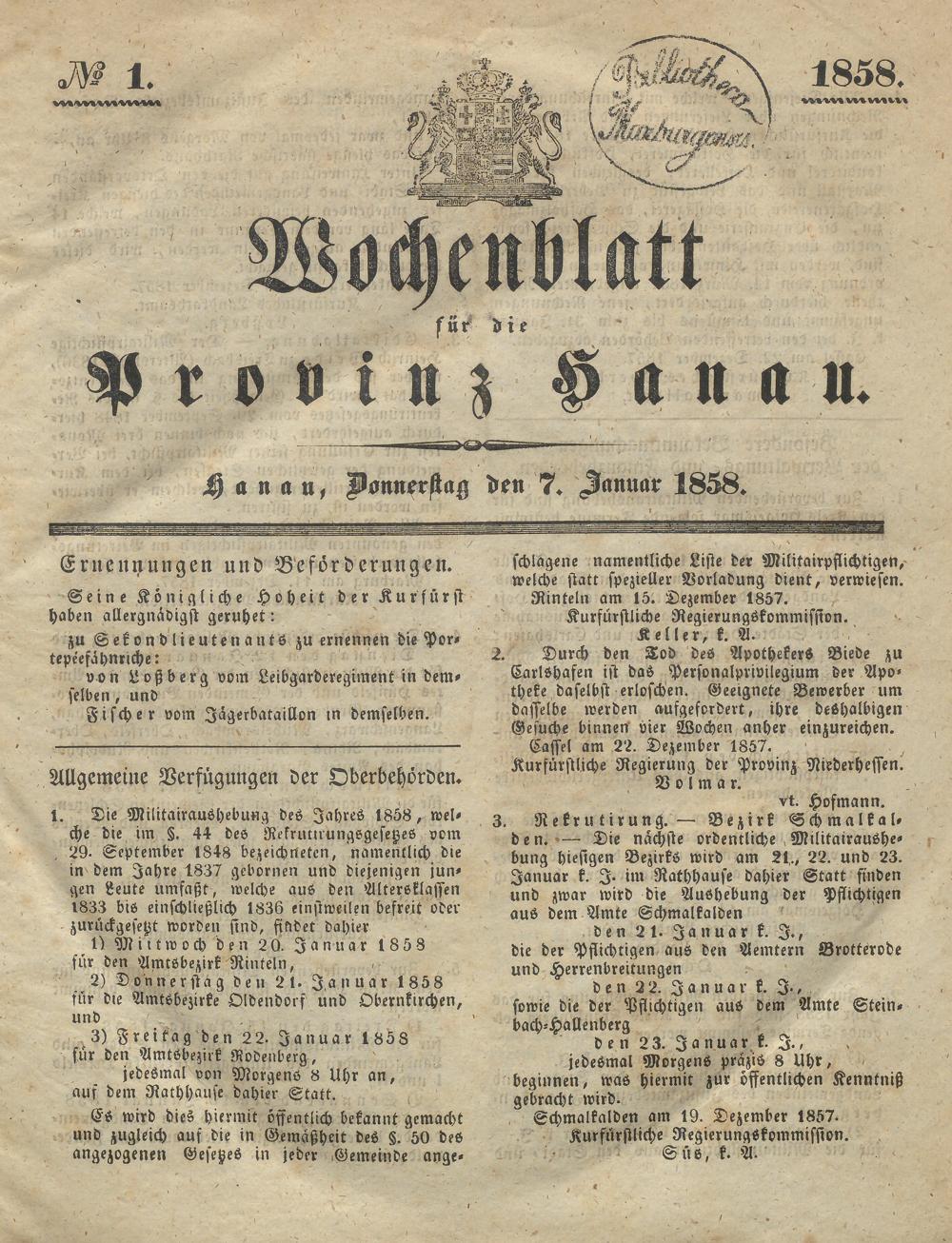Wochenblatt für die Provinz Hanau. 1851-1866