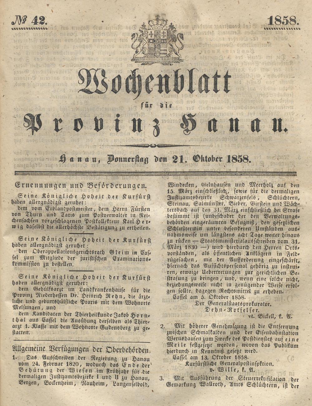 Wochenblatt für die Provinz Hanau. 1851-1866