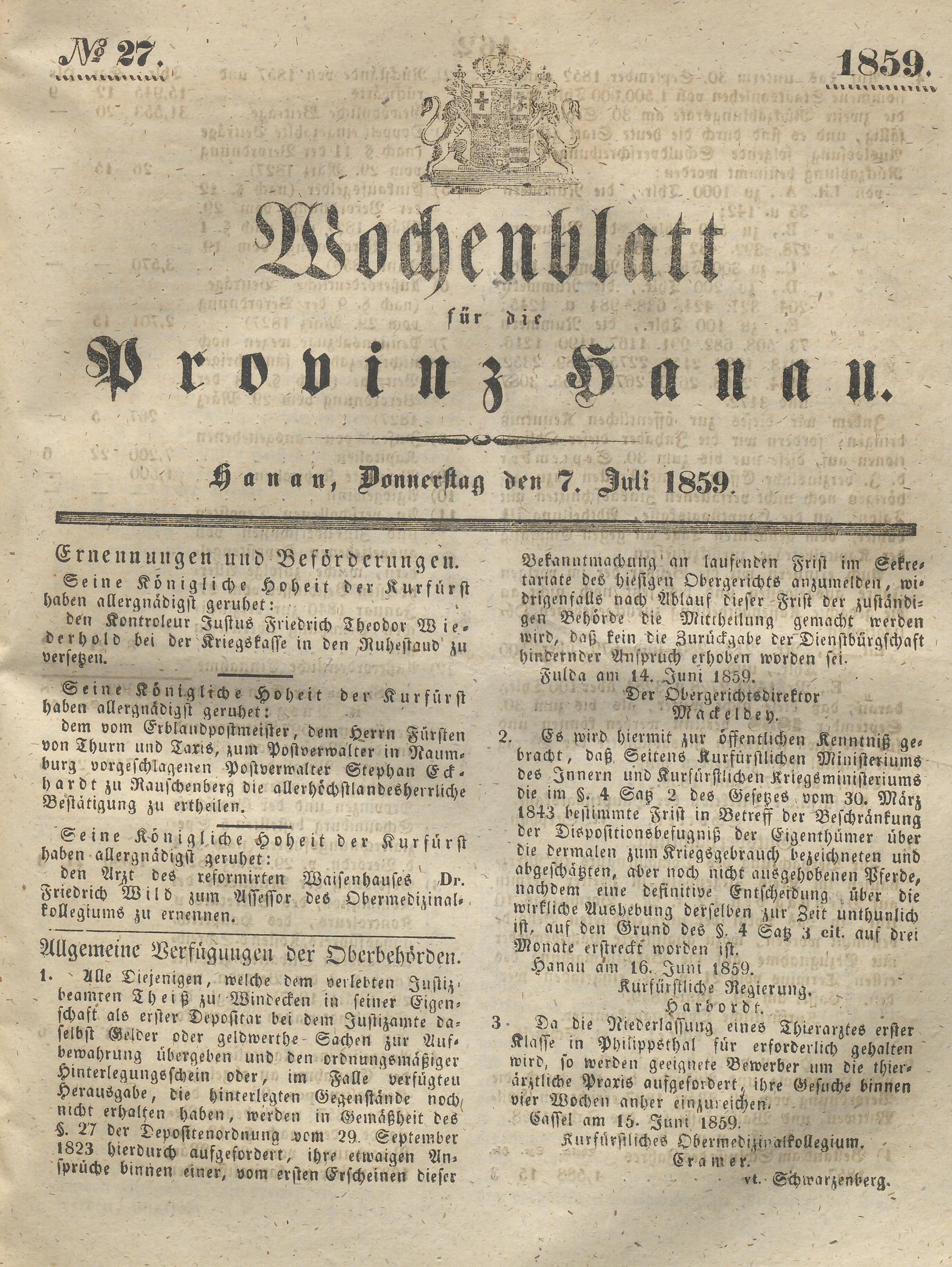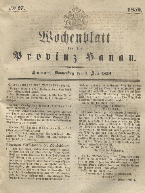 Wochenblatt für die Provinz Hanau. 1851-1866