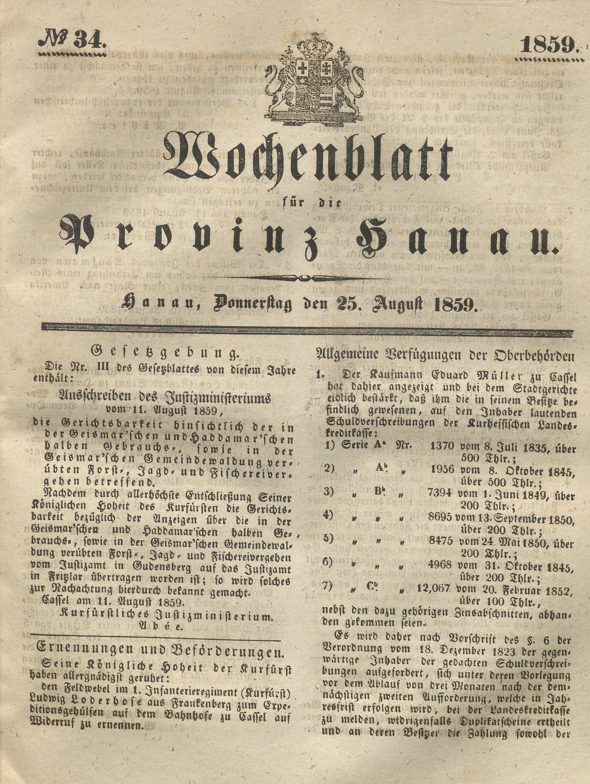 Wochenblatt für die Provinz Hanau. 1851-1866